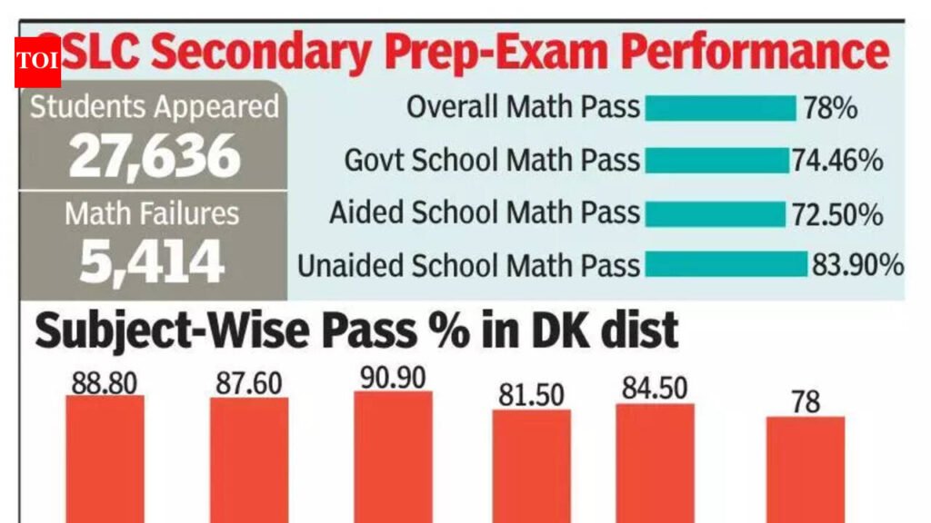 Mangaluru: With govt school students in Dakshina Kannada logging a 74.4% pass rate in mathematics in Jan’s second preparatory SSLC exam, the department of school education and literacy has rolled out special classes, deployed expert teachers and stepped up preparation in low-performing schools. Teachers trained online will now be assigned to support students ahead of the next exam, DDPI GS Shashidhar said.Department figures show 5,414 mathematics failures out of 27,636 students, prompting a stronger remedial push before the finals. Mathematics logged an overall pass percentage of 78%, compared with first language (88.8%), second language (87.6%), third language (90.9%), science (81.5%) and social science (84.5%). Officials said the disparity has led schools to intensify remedial work before the next preparatory exam and the board test.A department official said aided schools posted 72.5% in mathematics and unaided schools 83.9%. Officials said the differences reflect varying support systems, even as the subject poses challenges across categories.Headteachers said persistent difficulty, especially in govt schools, stems from late academic focus and limited external support. One headteacher said that mathematics often receives concentrated attention only in SSLC, rather than being strengthened in classes 8 and 9; while govt high schools have well-trained teachers, outcomes have not matched expectations. The teacher added that mathematics cannot be mastered through memorisation, and many govt school students cannot afford the private tuition that aided and unaided school students rely on.An SSLC coordinator said repeated practice and revision are essential. Schools have begun targeted interventions after reviewing performance across the two preparatory exams and are using the data to identify weak areas and students needing additional support.Officials said model question papers and answer keys were distributed. Another official noted that small errors in applying formulae can derail entire answers, making the paper seem simple but confusing under pressure.The department said expert teachers will coach students who failed, with low-performing schools receiving focused attention ahead of the next preparatory test.