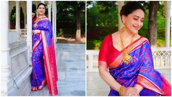 The centrepiece of Madhuri’s look is a traditional Odisha handloom silk saree that features a striking juxtaposition of royal blue and fuchsia pink. The body of the saree is saturated in a deep cobalt blue, providing a regal canvas for the intricate patterns.