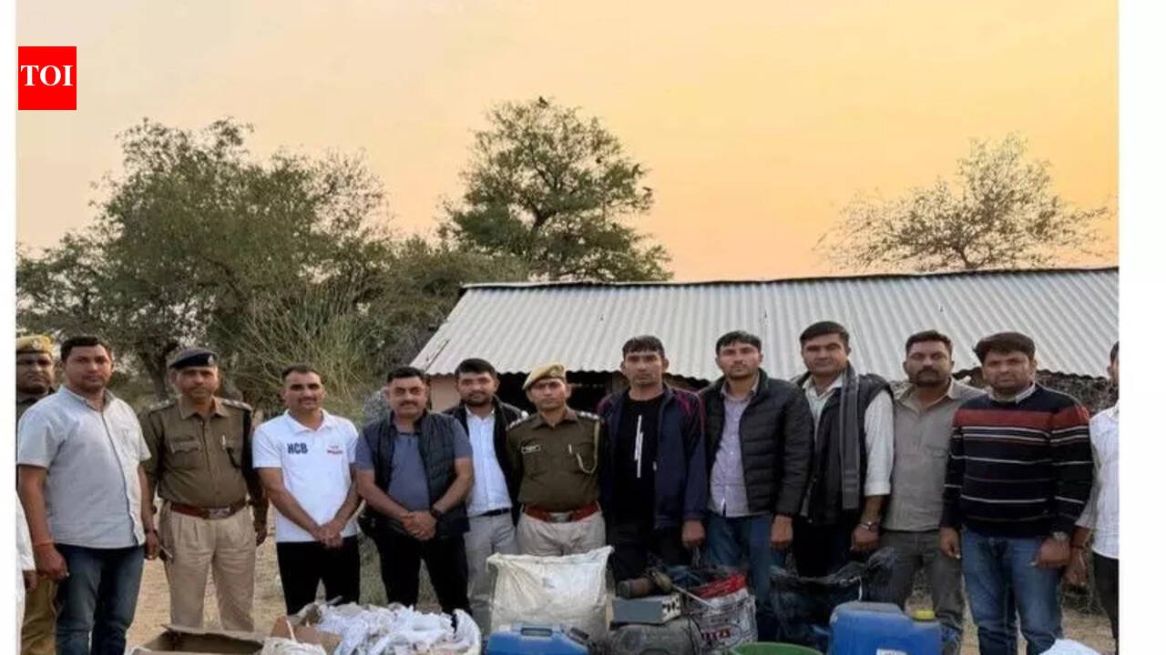 Jaipur/Jodhpur/Jaisalmer: Rajasthan Police and the Narcotics Control Bureau (NCB) Wednesday and Thursday smashed a sprawling MD drug network operating across western Rajasthan, busting clandestine laboratories in Barmer, Pratapgarh and Jalore.In Barmer Thursday, joint teams raided a makeshift MD manufacturing unit hidden deep inside sand dunes near the India–Pakistan border at Bhairudi village under Sedwa police station limits. Superintendent of Police Narendra Singh Meena said the operation was carried out by the Anti-Narcotics Task Force, the Narcotics Control Bureau, and the district special team.“The location was deliberately chosen for its isolation, with sand dunes on all sides and virtually no civilian movement,” Meena said.Police seized chemicals and equipment capable of producing nearly 178 kg of MD. Officers recovered sacks of chemical powder, liquid substances stored in jerry cans, glass flasks, test tubes, cooling rods fitted with cork nozzles, an electric thermal rod, a motorised stabiliser, and other laboratory apparatus. A forensic team examined the site.Police detaining landowner Ramjeevan , who told investigators that the seized material belonged to his cousin Rana Ram. Officers said a similar MD unit was detected in nearby dunes last July, indicating repeated attempts to operate drug factories in the desert. Sources said the latest unit was unearthed on specific inputs and linked to an earlier case in which a similar factory was busted Wednesday in Jalore district.In Pratapgarh, police arrested a wanted accused carrying a reward of Rs 25,000 in connection with an illegal MD factory busted earlier this month. Superintendent of Police B Adithya said teams arrested Rohit Mogra under Operation Chakravyuh.Police said the factory was detected during a Feb 2 raid on Water Works Road, where it allegedly operated under the cover of a grocery shop and grain warehouse. Officers seized 106 grams of ready MD, 114.75 kg of liquid chemical, and drug-manufacturing equipment. Rohit fled during the raid, abandoning his motorcycle, but was later tracked through technical surveillance to his in-laws’ house in Madhya Pradesh and arrested. A court remanded him to 5 days’ police custody, while teams continued to search for 2 other absconding accused.Meanwhile, in Jalore district, the NCB and district police busted another MD lab Wednesday, seized 4.9 kg of the drug, and arrested 3 people. Officials said the unit, equipped with industrial-grade machinery, had the capacity to manufacture up to 200 kg of MD.