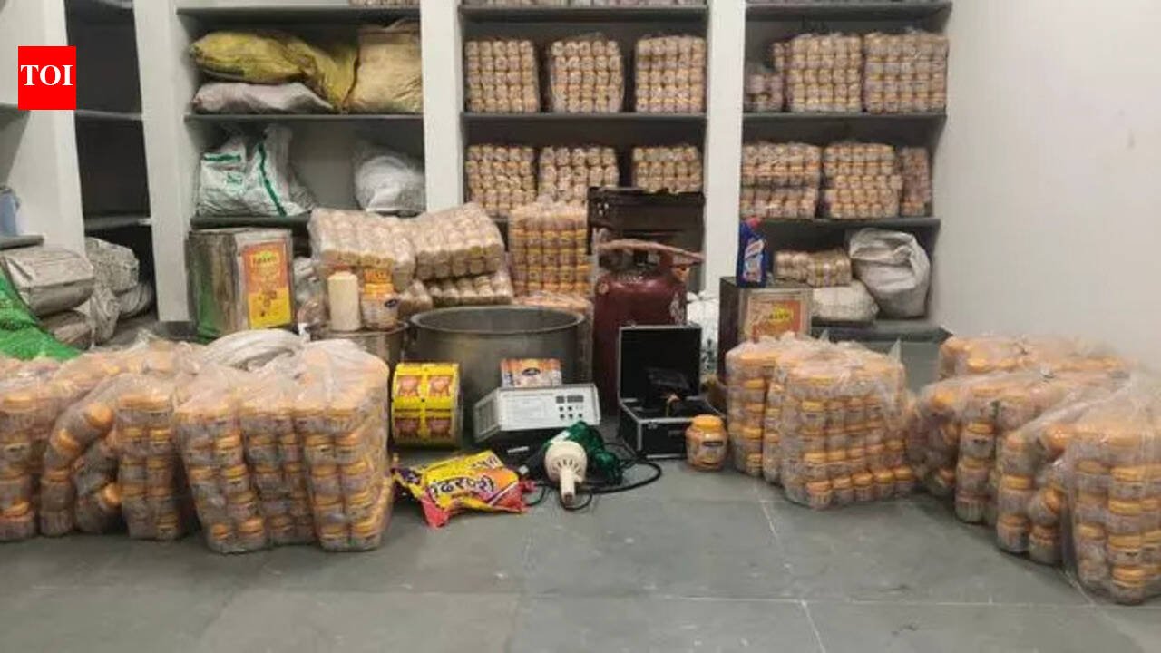 Surat: A Mandvi police team on Thursday busted an alleged spurious ghee manufacturing unit at Khedpur village near Mandvi in Surat district and seized 810kg of adulterated ghee worth around Rs 6.65 lakh. Police also found packs of toilet cleaner and tobacco at the unit.Police said the product was being sold under the brand name “Yadugiri Pure Cow Ghee”, with packaging that described it as premium quality. During the raid, officers recovered about 97,000 stickers of the brand meant for ghee packs. Based on the number of stickers and containers found, police suspect it to be a large-scale racket. The unit operated from premises in Agreshwar City Point and had been active for the past few months. Investigation revealed that Hemraj Rajpurohit, 39, was allegedly running the operation from his house, police said. From the house, police recovered equipment and materials allegedly used for making and packing the fake ghee, including a gas stove, cooking gas cylinder, two steel containers, an electric weighing scale, synthetic food colour, heat guns, an electromagnetic induction foil capping machine and batch coding and packaging machines. Police also seized plastic bottles of different sizes and various stickers meant for application on the bottles. In addition, police seized around 1,000 toilet cleaner bottles with thousands of stickers, 1,960 tobacco pouches and about 200 litres of acid stored in four barrels. A food and drug control department registration certificate was also found at the site. Police said further investigation is underway to identify the source of raw materials, trace the distribution network and determine whether other products were being repackaged or mislabelled. Samples of the seized items have been sent to a laboratory for testing, after which police will decide their course of action.
