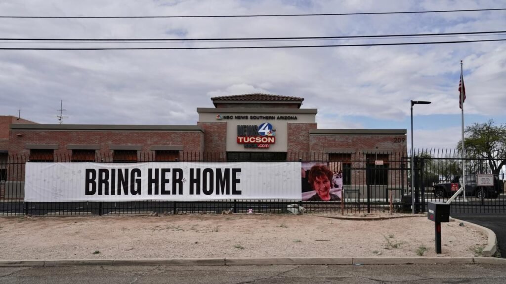 A banner reading “Bring her home” on a fence outside of the KVOA news station in Tucson, Arizona, on February 13, 2026.