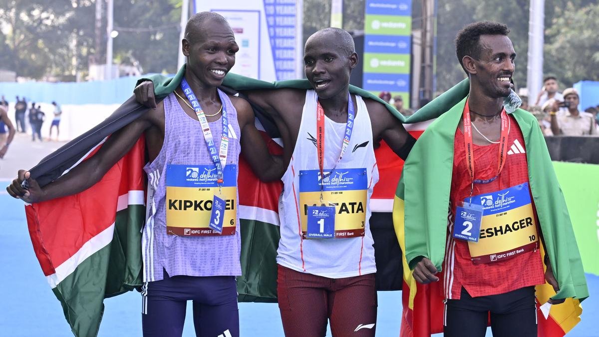 Matata, centre, Teshager, right, and Kipkogei after their podium finish in the 20th edition of the Vedanta Delhi Half Marathon 2025, at the Jawaharlal Nehru Stadium in New Delhi on Sunday, October 12, 2025.