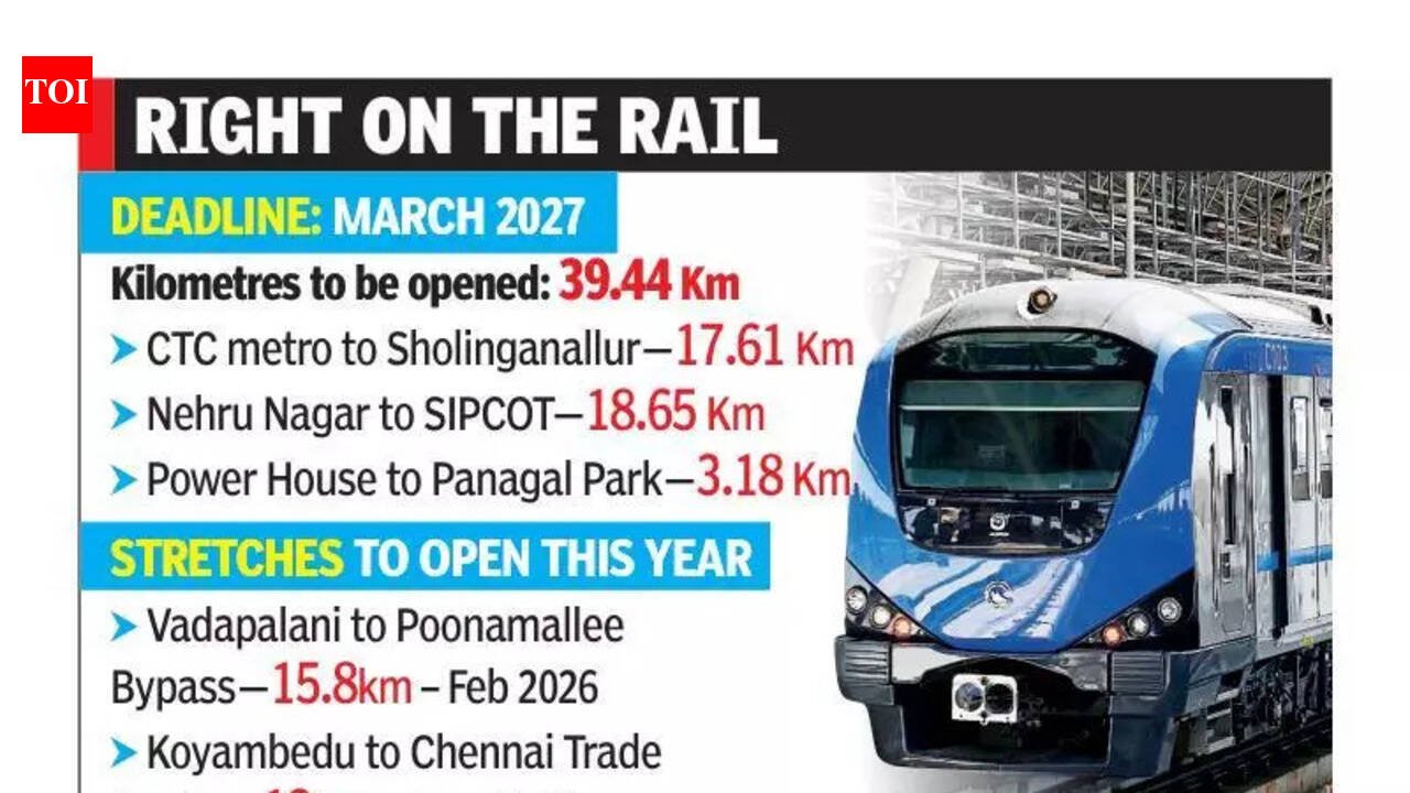 “Only the underground stretches will be left after that, and those are expected to be ready by 2028. We are also planning to open a small stretch between Powerhouse and Panagal Park on Corridor-4 by March 2027,” a metro rail official said.However, large sections in core city areas such as Mylapore, Villivakkam and Nungambakkam, are likely to remain blocked.Meanwhile, the Vadapalani-Poonamallee stretch is set to become the first operational segment of Phase-2, expected to open later this month. The section from Koyambedu to Chennai Trade Centre is targeted for commissioning by June 2026.Officials, however, acknowledge challenges. While work on Nehru Nagar-Sholinganallur stretch is progressing rapidly, the Sholinganallur-Siruseri section is slower in some pockets. “We handed over land for entry and exit points along the entire OMR stretch two months ago. We should be able to finish on time,” the official said.