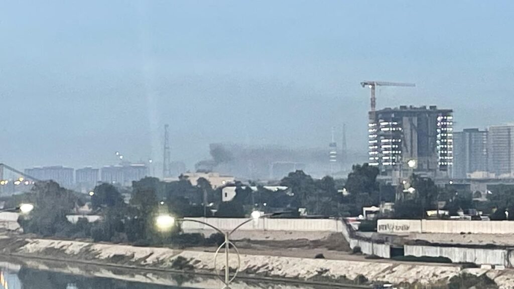 Smoke rises following a drone attack on the US embassy in Baghdad on March 14, 2026.