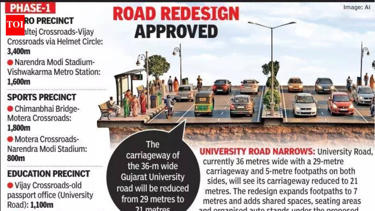Ahmedabad: Barely a month after halting six road redesign projects for want of a citywide footpath policy, the Ahmedabad Municipal Corporation has approved a fresh set of projects worth Rs 334.38 crore across 12 stretches in western Ahmedabad. The decision, taken as part of a larger Rs 589-crore infrastructure package, was cleared as the elected wing completed its five-year term.On March 5, the AMC standing committee approved road projects worth a total of Rs 589 crore. This included Rs 255 crore for the Narol Circle–Naroda Patiya corridor and Rs 334.38 crore for 12 roads grouped under Thematic Precinct Phase-1. These corridors fall within metro, sports and education precincts and are intended to support infrastructure around transit nodes, sports venues and academic hubs. The redesign focuses on wider footpaths, service lanes, green buffers and shared spaces but raises concerns about reduced space for vehicles, they added.The approvals come weeks after former standing committee chairman Devang Dani intervened in a similar project. On Jan 21, Dani inspected a redesigned connector between CG Road and Mithakhali Circle and ordered work to stop. The 18-m right-of-way design had allocated 9m to footpaths and utilities, leaving 9m for vehicle movement. He subsequently extended the halt to six roads in the Law Garden-Mithakhali area, part of a Rs 100-crore package. “He directed the municipal commissioner to frame and approve a footpath policy before green-lighting any new works,” says a senior AMC official.Despite the policy still being awaited, the committee has now cleared the 12 new road projects. The AMC’s initial estimate for the works was Rs 294.14 crore, but the tenders approved amount to Rs 334.38 crore. One of the most significant changes will be on University Road. The road is currently 36m wide, with a 29-m carriageway and 5-m footpaths on both sides. Under the redesign, the carriageway will be reduced to 21m, while footpaths will expand to 7m along with additional shared public spaces, seating areas and organised auto stands.Motorists and traders in some areas have expressed concern that narrower carriageways could worsen peak-hour congestion. AMC officials, however, say the redesigned corridors are expected to improve traffic flow through clearer kerb layouts, better pedestrian infrastructure and service lanes. The new plans do not include on-street parking.