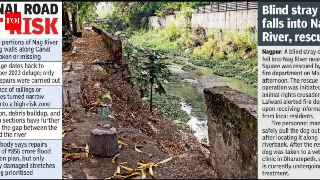 Nagpur: Retaining walls along Nag River on Canal Road have slipped into a precarious condition, raising alarm among residents and commuters who fear a serious accident if repairs are not taken up urgently.Large portions of the wall, particularly in Ramdaspeth, are broken or missing. The damage dates back to September 2023 deluge, which weakened the structure at multiple points. Nagpur Municipal Corporation (NMC) carried out partial restoration soon after, but work has since stalled, leaving long stretches exposed.A TOI visit found that the absence of railings or barricades has turned the narrow road into a risky corridor for pedestrians, cyclists and motorists. With river flowing immediately beside carriageway and no buffer in place, even a minor misstep or skid could lead to a fall into the water.Several stretches show signs of prolonged neglect, including eroded edges, debris accumulation and damaged stone pitching. In some sections, the riverbank has caved in, further shrinking gap between road and the river. With Canal Road emerging as a premium residential belt, residents also flagged risks from vehicles being parked along the embankment.“We use this road every day, and it has become increasingly unsafe,” said Alisha Khobragade, a resident of Canal Road area. “At night, visibility is low, and with no proper wall or railing, anyone could accidentally fall into the river.”“Temporary barricading was done to rebuild a broken bridge over the river, but once the work was done, the barricading was also removed,” said Shirish Patane.A senior official from Dharampeth zone said reconstruction of retaining walls is part of the Rs856 crore flood mitigation plan launched after the September 2023 deluge. “Priority has been given to stretches washed away or severely damaged during the rains. For other sections, funds are allocated only when a stretch is on the verge of collapse or in a highly dilapidated condition. The plan does not cover a comprehensive revamp of all retaining walls,” the official said.