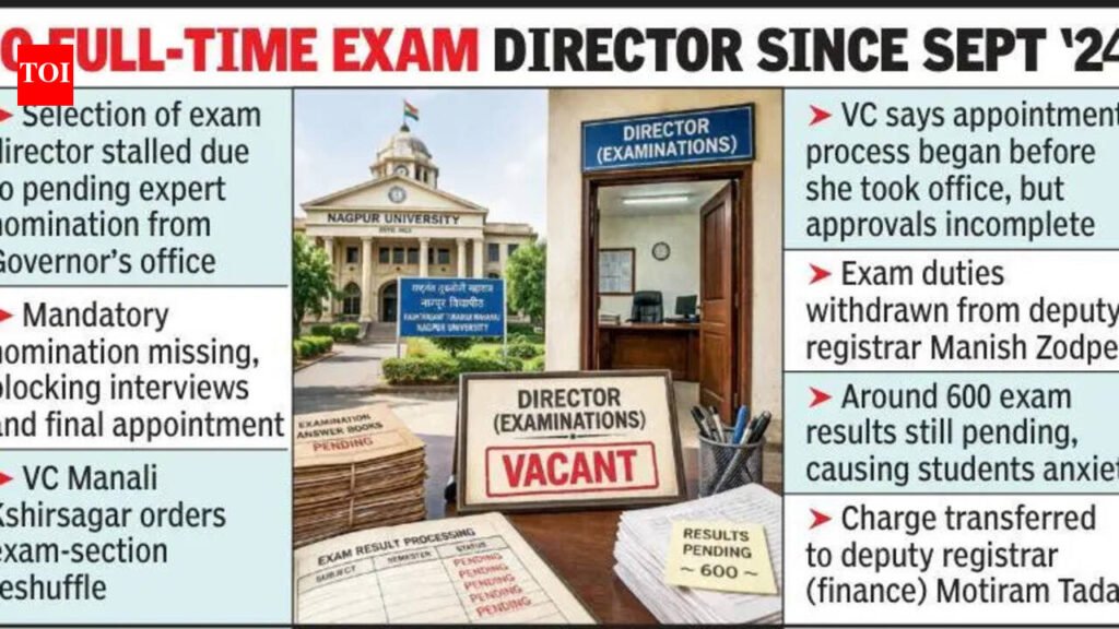Nagpur: The appointment of a full-time director of Nagpur University’s board of examinations and evaluation continues to remain in limbo, even as vice-chancellor Manali Kshirsagar has initiated a major reshuffle in its examination section following mounting delays in result processing. The post has been lying vacant since September 2024, with few in-charge officers appointed in between.The selection process for the crucial post has hit a roadblock due to the pending nomination of an expert member from the Governor’s office, a mandatory requirement to complete the selection panel. Without the nomination, the university is unable to proceed with interviews or finalise the appointment.Amid the delay, Kshirsagar has withdrawn examination-related responsibilities from deputy registrar Manish Zodpe, citing lapses in handling exam work, particularly the delay in declaring results. Around 600 results are still pending, adding to student anxiety and administrative pressure. The charge has been handed over to deputy registrar (finance) Motiram Tadas. Interestingly, Zodpe is among the 15 applicants shortlisted for the post of full-time exam director.Talking about the delay in appointing a full-time director, the vice-chancellor said the process was initiated before she had assumed office but remains incomplete due to the standard procedural requirements.“The entire process, including advertisement and application procedures, was completed before I joined in December last year. The state has seen multiple acting governors, and we are required to obtain approvals for the concerned selection committee. Until those clearances are received, we cannot proceed with interviews,” she said.She added that several administrative processes, including recruitment, are dependent on govt approvals. The developments come at a time when the university’s examination system is under scrutiny, with delays in results and lack of key appointments raising concerns over administrative efficiency.
