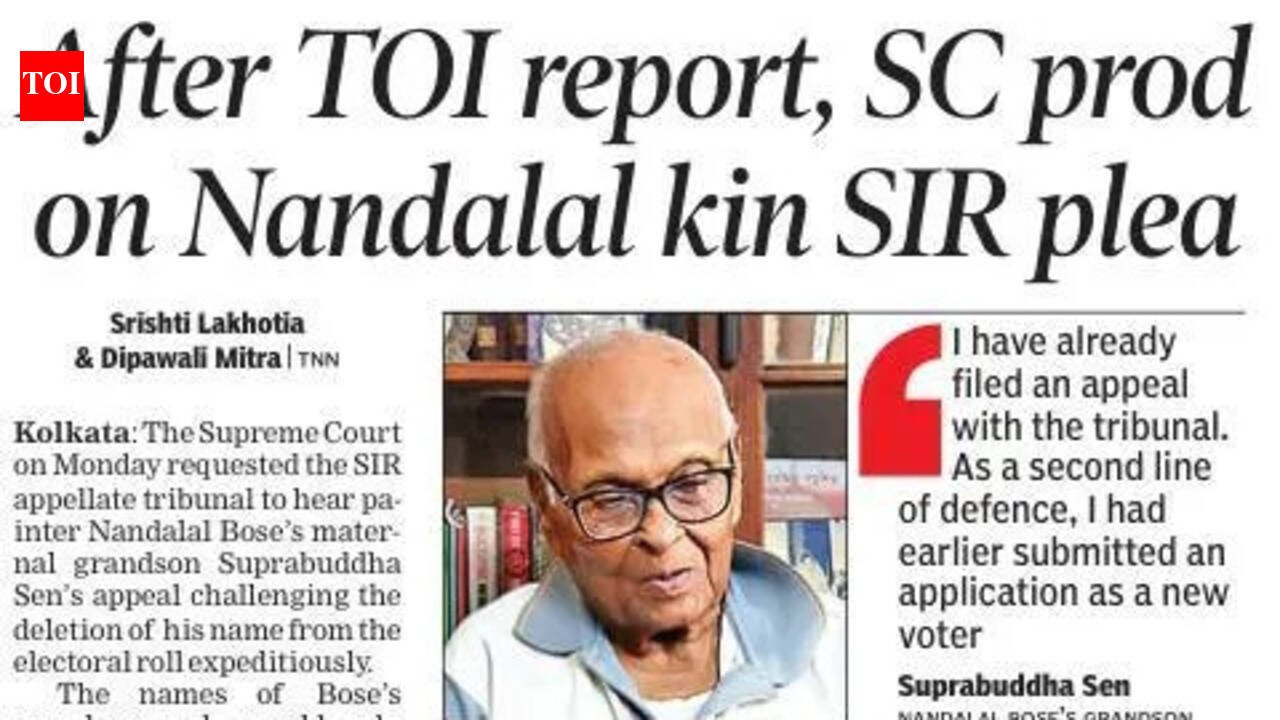 Kolkata: A special bench of appellate tribunal directed the EC to reinstate the name of the maternal grandson of artist Nandalal Bose, Suprabuddha Sen, 88, and his wife, 82, in the electoral rolls, following the SC order. A senior EC official said, “The names of the family members of Nandalal Bose have been cleared.”The Supreme Court on Monday requested the tribunal to hear his appeal challenging the deletion of his name from the roll by April 9. Advocate Menaka Guruswamy, representing the state govt, flagged the deletion of his name from the electoral roll post adjudication. An interlocutory application (IA) was also filed requesting urgent hearing by the tribunal. “We would not have any illustrations in the Constitution if not for his grandfather,” Menaka told the bench. Sen said, “I don’t know why it was deleted. Now, I hear that they have reinstated the names. It may be because I am Nandalal Bose’s grandson and due to media attention. I feel bad about lakhs of others whose names were deleted.” tnn