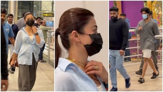 For accessories, Rashmika styled the simple, laidback outfit with striking jewellery pieces, including her boulder-sized diamond wedding ring, a multi-string necklace, and a stylish watch. With her hair slicked back in a ponytail and a minimal makeup look, she gave the airport fit a finishing touch.