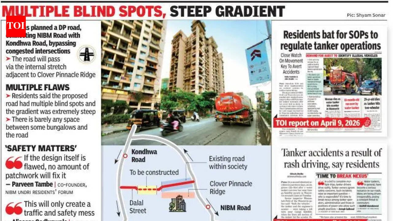 Pune:Residents in the vicinity described a proposed Development Plan road connecting NIBM Road to Kondhwa Road as a death trap, citing its steep gradient and multiple blind spots.NIBM and Undri residents recently intensified their opposition to the road passing via the internal stretch adjacent to Clover Pinnacle Ridge. They feared reckless tanker drivers could cause havoc on the stretch. Parveen Tambe, co-founder of NIBM Undri Residents’ Forum, said they were planning a protest on the weekend.The road department of Pune Municipal Corporation (PMC) was clueless about the issue. “I am not aware of residents opposing the DP Road. I will look into the matter,” said Rajesh Bankar, the chief engineer of PMC’s road department.Potholes, loose rubble and uneven surfaces on NIBM Road have long been a concern for residents. They said the larger threat wasin the design and execution of the proposed Development Plan (DP) road. The recent accidents involving tankers heightened their worries.The proposed DP Road would allow traffic to flow from Undri towards Kondhwa Road, bypassing choked intersections such as Baker’s Point Chowk and Kausarbaug Chowk. Tambe said, “The proposed road has serious flaws. It has no chamber. There are multiple blind spots and the gradient is extremely steep. There is barely any space between some bungalows and the road. There is no margin for safety.”“When a safer, parallel 24-metre road can be opened, why push this? If there are casualties tomorrow, who will be responsible? We are struggling with steep stretches like Ishrat Baug and the Pinnacle approach road,” said Tambe, noting that the work on the Pinnacle access road had been going on for over four years.Residents said daily commutes along NIBM Road had become increasingly hazardous. They claimed that motorists were forced to slow down abruptly or swerve to avoid damaged patches, while speeding tankers and other heavy vehicles made life risker on the stretch. They stressed that introducing a poorly planned DP road into this strained network would only worsen the situation.Aliasgar Godhrawale, secretary of Konark Indrayu Enclave Phase 1, said, “The NIBM Road’s gradient has been flattened from NIBM Chowk to Clover Hills, but the road becomes extremely steep between Kundan Peak and Konark Indrayu. The Clover Pinnacle Ridge is in between. Now imagine vehicles coming down such a steep slope and meeting another gradient (of the proposed DP road) at a near-perpendicular angle. No matter how many speed breakers you install, heavy vehicles like construction trucks and water tankers can lose control and crash head-on,” he said.Bhupendrasingh Bindra, secretary of Clover Pinnacle Ridge, said repeated meetings with authorities did not yield results. “They are still adamant and are now asking us to give everything in writing,” he said.Bindra also pointed to complications over the land ownership. “The road was shown as privately owned and later handed over to the PMC in Jan 2025. Soon after, we received a notice to demolish a wall built by a builder, assuming it was built by residents. The wall has existed since 2004. We only repaired it after it was damaged,” he said.A road safety report commissioned by residents and prepared by Global Traffic Solutions reinforced their concerns. It found that the 375-metre stretch had gradients ranging from 10.6% to 13.7 %, far exceeding the Indian Roads Congress limit of 4%, significantly increasing the risk of brake failure, especially for heavy vehicles.It also highlighted that the intersection sans signal in the area handled over 63,000 cars daily and recorded 13 crashes between 2022 and 2024, including four fatalities. Poor visibility, lack of pedestrian infrastructure and constrained road geometry further compound the risks.