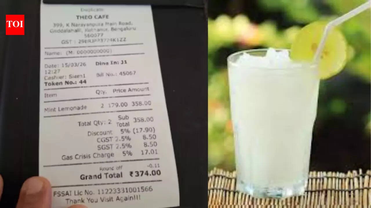 BENGALURU: ‘When life gives you lemons, make lemonade,’ there goes the adage. But how about a lemonade with a twist in the tale? Or, shall we say, with a sting in the tail in the form of ‘gas crisis charge’? A bill from a city cafe went viral on social media Sunday after a customer spotted this rather unusual entry on the receipt while paying for two mint lemonades, sparking online outrage and humour.The Theo Cafe bill showed two mint lemonades priced at Rs 179 each. After a 5% discount of Rs 17.9, CGST and SGST at 2.5% each were added. However, what created a buzz was a separate ‘gas crisis charge’ of 5%, or Rs 17, added to the total, bringing the rounded-off final payable amount to Rs 374.Cafe owner Avinash told TOI the entry appeared due to a system-generated billing update over the ongoing LPG supply shortage. He claimed the customer was never charged the extra a mountThe clarification notwithstanding, an image of the bill made its way to microblogging platform X, where it triggered a flood of reactions from amused and annoyed users alike, with many questioning how cooking gas could have been involved in the making of lemonade in the first place? One user on X, KTPeriPeri (@kaarnama13), joked: “Lemonade banane mein kaunsa gas lagta hai (what gas is required to prepare lemonade).” Another sarcastically posted: “Nimbu garam karke daala hai kya,” wondering whether the lemons were heated before being squeezed in.Others suggested, in a humorous vein, the cafe might have added gas inside the lemonade to make it fizzy.Some users also raised legal concerns, arguing that such charges could amount to an unfair trade practice. One comment claimed adding such extra fees could violate provisions under the Consumer Protection Act, 2019.