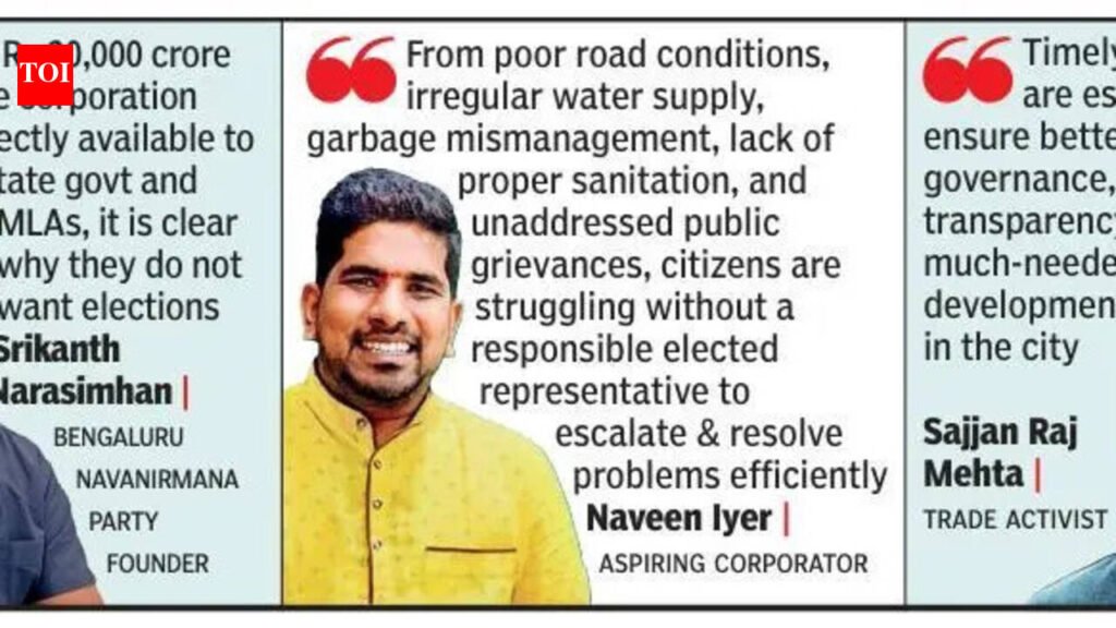 Bengaluru: Citizens and civic activists have taken strong exception to the possibility that the state govt could place an affidavit before the apex court seeking more time to conduct civic polls in the city.The Supreme Court has placed a deadline of June 30 for elections to the five city corporations under Greater Bengaluru Authority (GBA). However, the govt might be approaching the court to extend the deadline, citing Census 2027.Bengaluru NavaNirmana Party founder and general secretary Srikanth Narasimhan said the top court had already extended an earlier deadline and specified that this would be the “final indulgence” on this matter. “Be it BJP earlier or Congress now, they have found creative ways over the past six years to keep delaying these elections,” he said, adding that it is now up to the judiciary to uphold the Constitution.Aspirants looking to contest the upcoming polls feel the elections cannot be delayed as the city is already witnessing poor infrastructure and endless grievances. Naveen Iyer, a civic leader and aspiring corporator from Rajajinagar, said, “We are already witnessing the consequences of not having an elected corporator in our wards. Day by day, civic issues are increasing with no direct accountability. While administrative responsibilities like census are important, they should not come at the cost of democratic processes. Elections are the backbone of grassroots governance, and any delay weakens the connection between people and administration.”Access to local elected representatives is another point that citizens are raising. Trade activist Sajjan Raj Mehta said: “We cannot contact MLAs and MPs for civic issues. It is the elected corporator who needs to respond to such problems. Responsive and accountable local leadership will play a key role in addressing the city’s pressing challenges and improving citizen welfare.”He also highlighted the recent comparison of Bengaluru with cities like Hyderabad. “The city may be lagging behind due to collapsing infrastructure. Newly elected corporators and mayors will help the city grow as they will have to work efficiently to prove themselves,” he added.GBA chief commissioner Maheshwar Rao declined to comment on the matter, saying it will be addressed directly by govt.