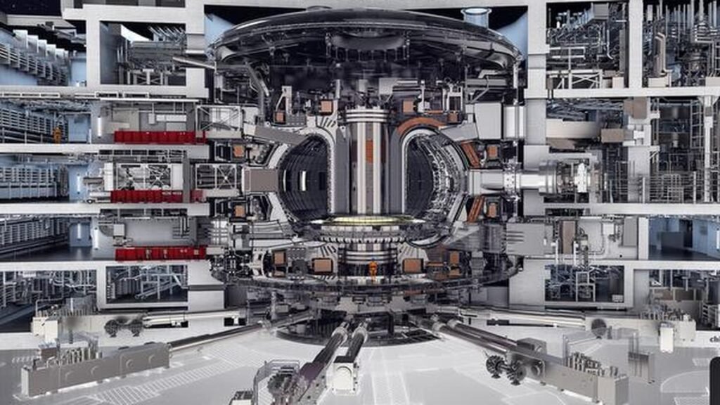 An exploded view of the ITER nuclear-fusion facility. A human figure in orange is shown just below the image’s centre for scale. The reactor vessel is visible at the centre (with the D-shaped cross-section).