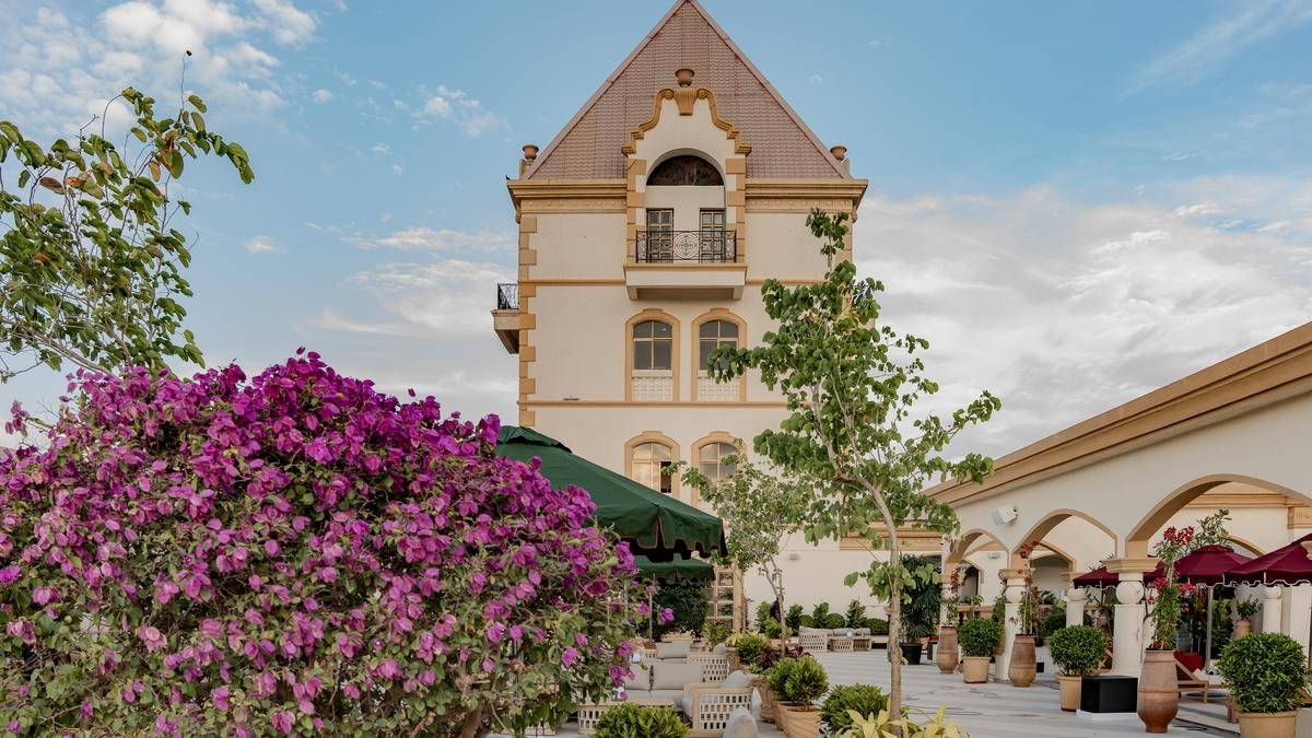 The imposing, neo-classical chateau, surrounded by a 66-acre vineyard (beyond which are pomegranate and solar farms, as well as 4,000 acres of reserve forest), is fronted by a grand fountain from the Mallya era. Sweeping twin staircases frame the entrance, leading you into an eclectic interior — a 19ft x 7ft custom wall installation by Jaipur Rugs depicting a typical day at Irada anchors the lobby, and Italian bistro Rosso (open to non-residents) sits right across.