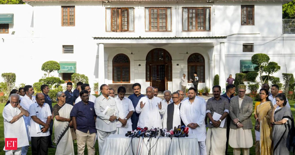 “We are all in favour of the women’s reservation bill. But the way in which they have brought it raises concerns. It is politically motivated. The government is doing this just to suppress the Opposition parties. We have consistently supported women’s reservation, but we insist that the earlier (2023) amendments be implemented. The government is playing tricks through delimitation. We should unitedly fight against it in Parliament. We are not against women reservation, but the way in which they have brought the bill, with delimitation and without even clearing census. All powers of the Constitution are being taken by the executive,” said Congress chief Mallikarjun Kharge after the meeting.