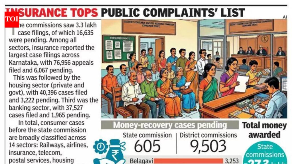 Bengaluru: Getting a verdict is only a small — if not easy — part of a legal fight. The bigger battle is against non-compliance with court orders. Karnataka continues to see high pendency in the execution of consumer commission orders, with thousands yet to receive their awarded amounts as of Jan 2026.According to Karnataka State Consumer Disputes Redressal Commission, 10,108 execution cases are pending. The state has 605 execution petitions pending out of 1,841 filed since inception. At the district level, the burden is huge: Across 34 district commissions, 68,606 execution petitions were filed, of which 59,103 were disposed of, and 9,503 cases remain pending for recovery of money or compliance.The orders should be obeyed and the award honoured within 30 days, failing which a penalty of Rs 25,000 to Rs 1 lakh will be slapped on the defaulting parties.Pendency is high in urban centres: Belagavi tops, followed by Bengaluru Urban, Mysuru, Dharwad, and Bengaluru Urban IV Additional.While the commissions are relatively effective in deciding complaints, the post-order enforcement stage continues to challenge the consumer dispute mechanism, particularly in high-volume districts.Officials said pending cases range from recovering money to returning original sale deeds, handing over flats, or completing bank-related transactions. “Often, opposite parties are unwilling to pay even after orders, creating hurdles and disputes, though the commission has already passed directions for compliance,” an official added.A consumer from Bengaluru’s Jayanagar, who won a case against a telecom giant, is still waiting for Rs 10 lakh money. He said: “I had paid the money under the telecom company’s housing project. It’s my hard-earned money.”Unlike civil courts, officials said, consumer forums do not have bailiffs to enforce orders, leaving implementation largely to the opposite party’s willingness to comply. Some consumers approach civil courts for contempt proceedings. To bridge this gap, the commission sought police assistance in executing orders, particularly in cases involving property attachment or arrest warrants.In response, the police department assigned one cop to each commission, which the officials say has significantly helped in assisting the commissions and protecting consumer interests.Insurance tops the complaints listThe commissions saw 3.3 lakh case filings, of which 16,635 were pending. Among all sectors, the insurance sector reported the largest case filings across Karnataka, with 76,956 appeals filed and 6,067 pending. This was followed by the housing sector (private and govt), with 40,396 cases filed and 3,222 pending. Third was the banking sector, with 37,527 cases filed and 1,965 pending.In total, consumer cases before the state commission are broadly classified across 14 sectors, including banking, railways, airlines, insurance, telecom, postal services, housing (govt and private), electricity, medical negligence, defective household goods, education, road transport, miscellaneous services, and e-commerce.Box 1: Money recovery cases pending Data as of Jan 2026 State Commission: 605District Commissions: 9,503 BOX 2: Highest pendency districtsBelagavi – 3,253 Mysuru – 1,328 Bengaluru Urban – 1,311 Dharwad – 502 Bengaluru IV Additional – 461 BOX 3: Total money awarded State Commissions: Rs 27.3 lakh District Commissions: Rs 16.5 crore