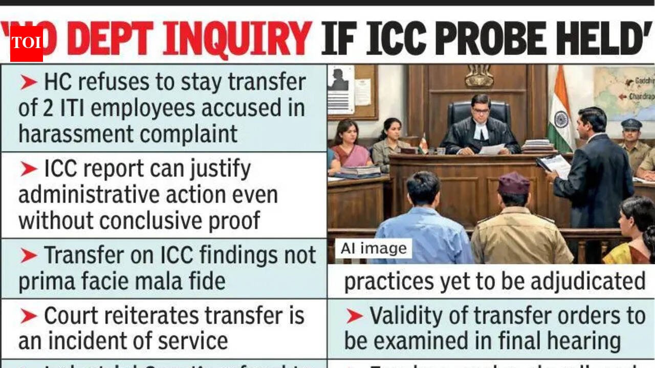 Nagpur: Nagpur bench of Bombay high court recently upheld interim orders refusing to stay transfer of two Industrial Training Institute (ITI) employees, ruling administrative action based on an internal complaints committee (ICC) report cannot be termed prima facie mala fide even if allegations of sexual harassment remain unproven.Justice Prafulla Khubalkar dismissed petitions filed by a storekeeper and a craft instructor, both posted at ITI, Wardha, at time of the dispute. Petitioners challenged orders of Industrial Court here, which earlier rejected their plea for interim stay on transfer orders issued in July 2025.The case stemmed from a complaint filed by a woman colleague, following which the ICC conducted an inquiry and submitted its report on July 15, 2025. While the committee did not record definitive findings establishing harassment, it observed lack of direct evidence is common in such cases and found no reason to disbelieve complainant’s allegations. It recommended transfer of both employees and withholding of one increment.Acting on these recommendations, authorities transferred the instructor to ITI Bhamragad in Gadchiroli and the storekeeper to Pombhurna in Chandrapur. Petitioners argued that the transfers were punitive in nature, carried out without a formal departmental inquiry under service rules, and based on a flawed ICC process allegedly conducted in violation of provisions of the Sexual Harassment of Women at Workplace (Prevention, Prohibition and Redressal) Act, 2013.They further contended that ICC itself lacked jurisdiction and the action amounted to unfair labour practices. However, opposing the petitions, the state authorities represented by KH Bhondge and the complainant maintained that the transfers were administrative decisions taken in the interest of workplace safety and dignity, and were already effected.Concluding that the Industrial Court’s reasoning was neither arbitrary nor perverse, the high court dismissed both the petitions and declined to grant interim relief, while keeping all substantive issues open for determination in appropriate proceedings.