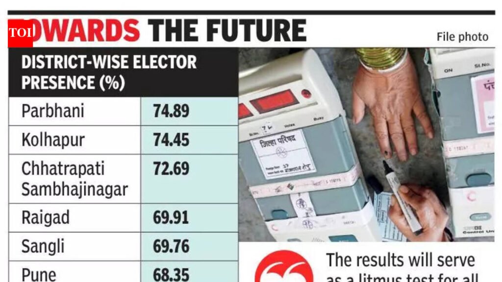 The highest turnout across 125 talukas at 74.89% was registered in Parbhani district, followed closely by Kolhapur (74.45%) and Chhatrapati Sambhajinagar (72.69%).Three districts recorded turnout above 70% out of the 12 that went to polls. Six districts fell in the 65%–70% range, while three remained below 65%, SEC data showed. In certain talukas, particularly in Kolhapur district, voter participation touched 80%.SEC chief Dinesh Waghmare said voting extended beyond the scheduled time in several areas. “Citizens were already in queues before 5.30pm and, therefore, voting continued till late in some interior rural parts. Voting percentages for ZP polls are usually high, as was the trend observed in earlier local body elections too,” he told TOI.The turnout compared favourably with other recent local body polls. Municipal council elections had recorded around 68% turnout, while elections to 29 municipal corporations averaged only 55%, indicating stronger voter engagement in rural local governance, said a poll expert.Male voters registered slightly higher participation at 69.6%, compared to 66.8% among women. However, female voter registration — 1.01 crore — was nearly at par with male registration of 1.06 crore — pointing to improved gender parity. Among those who voted, 74.06 lakh were men and 67.84 lakh women.The polls were keenly watched for political indications, particularly on the future direction and unity of the NCP, whose factions contested in alliance in parts of western Maharashtra. The elections, originally scheduled for Feb 5, were postponed to Feb 7 following the death of Ajit Pawar and declaration of three days of state mourning.Polling was held in Raigad, Ratnagiri, Sindhudurg, Pune, Satara, Sangli, Solapur, Kolhapur, Chhatrapati Sambhajinagar, Parbhani, Dharashiv and Latur districts.Political experts said the results would serve as a litmus test for all major parties. “The outcome will be crucial for the BJP, Shiv Sena factions, NCP factions and the Congress, as control of ZPs and PSs determines the implementation of rural development programmes and welfare schemes,” an expert said.Counting of votes will take place on Feb 9 at taluka-level centres from 10am, after which the model code of conduct will be lifted, election officials said.