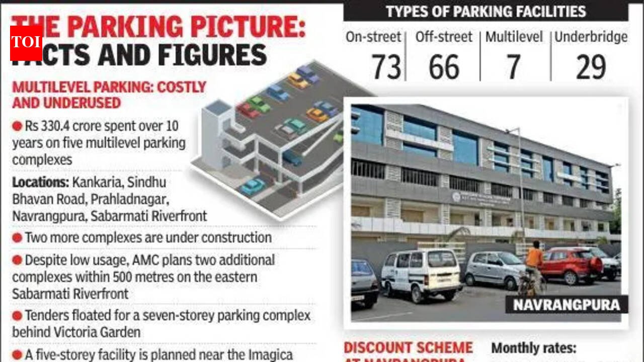 Ahmedabad: For more than two decades, Ahmedabad has been living with a problem it has quietly legalized. Three successive implementations of the Gujarat Regularisation of Unauthorised Development Act (GRUDA) — most recently in 2022 — effectively legalized illegal constructions in exchange for impact fees. Among the most problematic outcomes was the regularization of parking spaces in housing societies and commercial complexes that had already been built over or encroached upon. The result has been an erosion of formal parking spaces across the city, worsening congestion on already overburdened roads. For those elected to the Ahmedabad Municipal Corporation (AMC) in the 2026 civic election, resolving the parking crisis will be one of the toughest challenges.While the city has invested heavily in infrastructure, the returns have been limited. Over the past five years, several multilevel parking complexes have come up, but most have failed to attract users. A comprehensive parking development plan, promised for years, is still missing. Though a draft parking policy exists, there is no citywide, long-term roadmap to translate it into action.AMC officials say traffic congestion has worsened because of haphazard, on-street parking, often blocking emergency movement. An agency appointed by the corporation is currently preparing a parking plan, beginning with the western parts of the city. Roads are being surveyed, on-street parking zones have been identified, and no-parking areas marked.So far, parking has been prohibited within a 50-metre radius of more than 250 junctions in the city’s western zones, with signage installed and enforcement planned. Surveys to identify on-street and off-street parking spaces are underway, but work in the eastern zones has not yet begun. The designation of on-street parking on newly constructed western roads has been put on hold, and parking fees, which are central to demand management, are still undecided.An AMC official, speaking on condition of anonymity, said the state govt approved the parking policy in Oct 2021. It proposed the creation of a dedicated parking cell comprising AMC officials, traffic cops, Regional Transport Office representatives and experts. “The cell was meant to enforce parking bylaws, but a 10-year parking plan was a prerequisite,” the official said. Consultants were appointed for the western zones, but the parking cell has still not been formed, and the eastern part of the city remains untouched.Congestion, the official added, now affects not only commuters but also ambulances during peak hours. On April 5, the AMC issued a public notice requiring all commercial complexes to ensure vehicles are parked only in designated spaces. Residential and commercial buildings must file an annual self-declaration confirming that parking areas are free of encroachments. Societies with surplus parking may apply for parking sharing. The responsibility for violations rests with the building’s chairman or secretary.