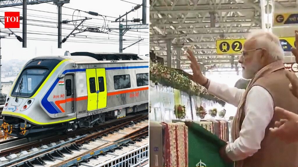Running along a 21-km corridor with 12 stations, its fully air-conditioned three-coach trains feature lightweight stainless-steel designs in green, blue, and orange. Energy-efficient and equipped with regenerative braking, CCTV, USB ports, and modern train automation systems, each train carries over 700 passengers, with 173 seats, including reserved spots for women, seniors, and differently-abled commuters.After the inaugration, PM Modi also took a metro ride to the Meerut South Station. Ahead of the inauguration, UP CM Yogi Adityanath announced that PM Modi will boost the development of ‘New Uttar Pradesh’ by launching the Meerut Metro and the Namo Bharat train in the city. Describing it as a milestone, he said, “today, a golden chapter will be added to Uttar Pradesh’s journey of progress.”Also see | Travel at 160 kmph on Namo Bharat: Check route, stations, timing — key detailsTogether, the transportation boost is expected to enable quicker intercity movement alongside efficient urban travel. The projects are also aimed at easing road congestion and reducing vehicular carbon dioxide emissions, in line with the PM’s focus on modern, seamless and sustainable public transport systems to improve ease of living.