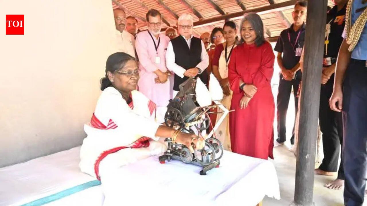 Wardha: President Droupadi Murmu on Thursday visited Sevagram Ashram and paid tribute to the ideals of self-reliance and khadi championed by Mahatma Gandhi by spinning the charkha. At Bapukuti, the President engaged in thread-making, drawing attention from those present as she highlighted the enduring relevance of Gandhian philosophy. She then toured key sites within the ashram, including Adi Niwas, Ba Kuti, and Gandhi’s office, where she was briefed on his simple lifestyle and work.Murmu also participated in prayer meeting and spent time experiencing the discipline and minimalism that define the ashram. She planted a sapling during her visit, conveying a message on environmental conservation.Earlier, the President was received at Sevagram helipad by Maharashtra governor Jishnu Dev Varma, revenue minister Chandrashekhar Bawankule, guardian minister Pankaj Bhoyar, collector Vanmathi C, and other dignitaries.The visit underscored the historical and cultural importance of Sevagram Ashram, instilling pride among citizens while the administration ensured smooth coordination of the high-profile programme.