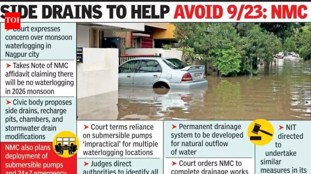 Nagpur: The Nagpur bench of Bombay high court has raised serious concerns over the Nagpur Municipal Corporation (NMC) preparedness to tackle monsoon flooding, observing that the civic body’s reliance on submersible pumps to remove accumulated rainwater was ‘impractical’.The observations came while hearing a PIL filed by Rajiv Jagtap, president of NGO Janmanch, regarding persistent waterlogging in several parts of Nagpur following the construction of elevated cement-concrete roads.A division bench comprising Justices Anil Pansare and Nivedita Mehta examined an affidavit filed by the NMC outlining measures planned before the 2026 monsoon. The affidavit stated that ‘in the ensuing rainy season, there will be no waterlogging in any part of Nagpur city’, and detailed steps proposed to improve drainage.Among the measures listed were the construction of side drains at appropriate locations to discharge rainwater, raising the height of existing stormwater drains along cement-concrete roads, building recharge pits in areas where elevated road levels caused water accumulation in residential premises, and installing chambers in low-lying plots connected to stormwater drains through PVC pipelines.The civic body also informed the court that a 24-hour emergency control room would operate during the monsoon and that high-capacity pumps would be deployed across city zones to remove accumulated water. The bench, however, expressed reservations about this approach. “The solution appears to us to be impractical,” the court observed, noting that water tends to accumulate at multiple locations across Nagpur each year.“It will be a challenging task to have these many submersible pumps, and further, to deploy them simultaneously at all the places,” the judges said, emphasising that such measures cannot serve as a long-term solution.Directing the civic body to adopt a more effective strategy, the court ordered officials to identify waterlogging-prone areas across the city and create appropriate drainage arrangements to ensure that accumulated rainwater can flow out naturally without manual intervention. The court also noted that NMC’s affidavit lacked a clear timeline for completing the proposed works and described the statement as “vague”. It therefore directed the civic body to complete all necessary drainage-related works before May 31, ahead of the monsoon season.During the hearing, the court also recorded that the executive engineer concerned was not present when the matter was initially called. The bench directed the chief engineer to remain present before the court later the same day. The bench also instructed the Nagpur Improvement Trust (NIT) to undertake a similar exercise for areas falling under its jurisdiction and to file a detailed affidavit before the next hearing.