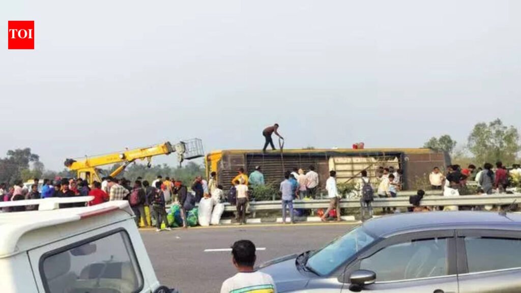 The bus driver, travelling from Ludhiana, in Punjab, to Darbhanga, Bihar, lost control and the bus flipped at high speed at around 3 pm. Eyewitnesses said the vehicle swayed violently before hitting a divider and flipping over.According to officials, 28 injured passengers, including seven children, were referred to the Apex Trauma Centre at Sanjay Gandhi Postgraduate Institute of Medical Sciences, Lucknow, while others were being treated at Lokbandhu Hospital, Gosaiganj Community Health Centre and KGMU Trauma Centre.Fifteen of the injured were rushed to KGMU Trauma Centre; of them, a woman with a head injury was in critical condition, while 14 others were stable, doctors at KGMU said.DM Vishakh G Iyer confirmed five deaths. Police commissioner Amrendra Singh Sengar informed the media that the driver, Som Pal, was taken into custody and an FIR was being registered.Among the five dead were Birendra (30), son of Sikandar Rao, a resident of Sitamarhi, Bihar; Anjali (8) and Priyanshu (15). Two other deceased — a six-year-old boy and a 30-year-old man — were yet to be identified.A disturbing video from the scene showed bodies toppling out of the bus windows as it was lifted upright by a crane. Several passengers were seen trapped or hanging from broken windows, crying for help.Transport dept officials suspect possible violations in the bus’s internal structure. A preliminary inspection suggests that the emergency exit may have been blocked and the number of seats had been increased beyond permissible limits.Some passengers claimed that over 50 people were on board, far over capacity. Most were migrant workers returning home ahead of Holi.The bus, registered in Haryana’s Panipat district in 2019, had valid fitness and insurance documents, but officials noted prior challans against it. A detailed mechanical and regulatory probe is underway.Traffic was briefly disrupted on the expressway after the accident but the road was cleared soon and normal traffic restored.