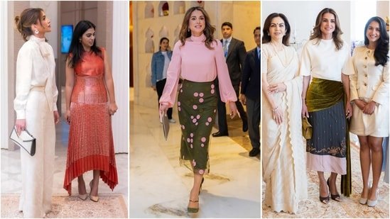 During her visit to the Ambanis, Queen Rania opted for a modern, eye-catching ensemble. She wore a Fendi midi skirt featuring a graphic pattern and sheer overlay, paired with a vibrant pink silk blouse and matching suede pumps. The ensemble perfectly balanced boldness with elegance, creating a polished look that stood out at the high-profile gathering.