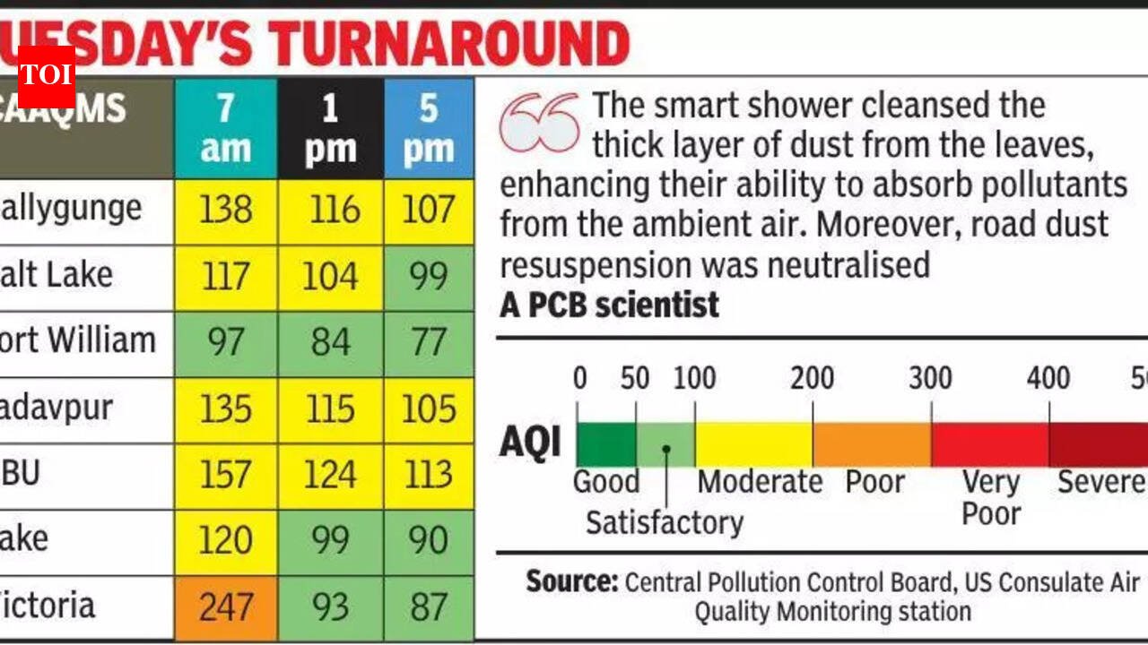 Kolkata: An early Tuesday morning shower swept across Kolkata like a natural cleanser, scrubbing layers of grime from the city’s tired skyline and delivering the best air quality it saw since Nov 3. The rain rinsed dust-laden tree leaves, soaked the parched topsoil that steadily released fine particles into the air, and settled road dust that stubbornly kept pollution levels elevated through a prolonged dry spell.For the first time in months, Kolkata’s overall Air Quality Index (AQI) remained in the ‘satisfactory’ range (51–100) through the day — a significant improvement after weeks of readings stuck in the ‘moderate’ range. The respite came amid a recent spike in respiratory ailments, offering residents a rare spell of clean, breathable air.The transformation was most dramatic around the Maidan, often called the city’s lung, where the green cover and open spaces amplified the rain’s cleansing effect. Continuous Ambient Air Quality Monitoring Stations (CAAQMS) at Fort William and Victoria Memorial Hall recorded some of the sharpest improvements. “The smart shower cleansed the thick layer of dust from the leaves, enhancing their ability to absorb pollutants from the ambient air. Moreover, road dust resuspension was neutralised,” said a pollution control board scientist. The long dry spell before Tuesday left the topsoil extremely dry and grassless in many areas, allowing fine particles to become airborne easily. Vehicular movement kept resuspending road dust, preventing the AQI from dipping below ‘moderate’ levels.Tuesday’s rainfall effectively reversed that trend. Leafy and grassy zones consistently recorded better air quality than densely built-up areas. Rabindra Sarobar in south Kolkata, another green pocket, saw its AQI improve from 120 in the morning to 90 by late afternoon, moving from ‘moderate’ to ‘satisfactory’. Salt Lake, too, entered the satisfactory range by evening, with readings improving from 117 to 99.In more built-up zones, the improvement, though evident, was less dramatic. Ballygunge’s AQI dropped from 138 at 7 am to 107 at 5 pm, remaining in the ‘moderate’ category. Jadavpur improved from 135 to 105, while RBU (B T Road) saw levels fall from 157 to 113 — still ‘moderate’ but significantly cleaner than morning readings.Environmental experts, however, cautioned that such relief is often temporary unless supported by sustained dust-control measures and increased green cover.