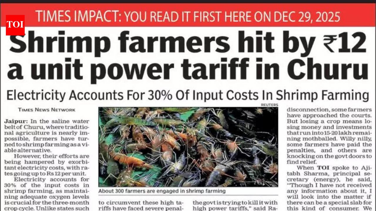 Jaipur: Shrimp farmers in Rajasthan, facing high electricity tariffs, may get relief after finance minister Diya Kumari announced in the State Budget that power rates will be reduced to spur the rural economic activity.Energy department sources said the govt is considering a separate tariff slab for shrimp farming, likely positioned between industrial and agricultural categories. The issue gained attention after TOI highlighted the farmers’ concerns with a news report titled “Shrimp farmers hit by ₹12 a unit power tariff in Churu” in its Dec 29 Jaipur edition.