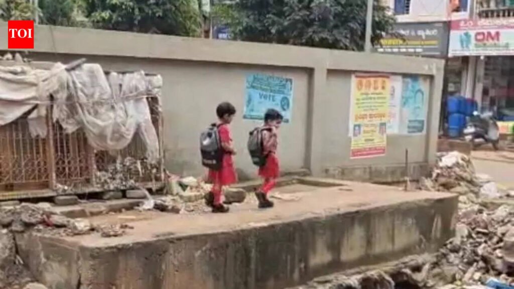 Pic: Two schoolchildren seen crossing the Rajanala at Myadar Oni in Hubballi as the concrete slab covering has collapsedHubballi: A concrete slab covering the Rajanala in HDMC Ward No. 65 collapsed on the main road connecting Myadar Oni in Hubballi, posing a threat to pedestrians and other road users. Residents said the slab remained unrepaired for the past 8 months and that the Hubballi-Dharwad Municipal Corporation (HDMC) built a barrier instead, making it difficult for pedestrians to move.