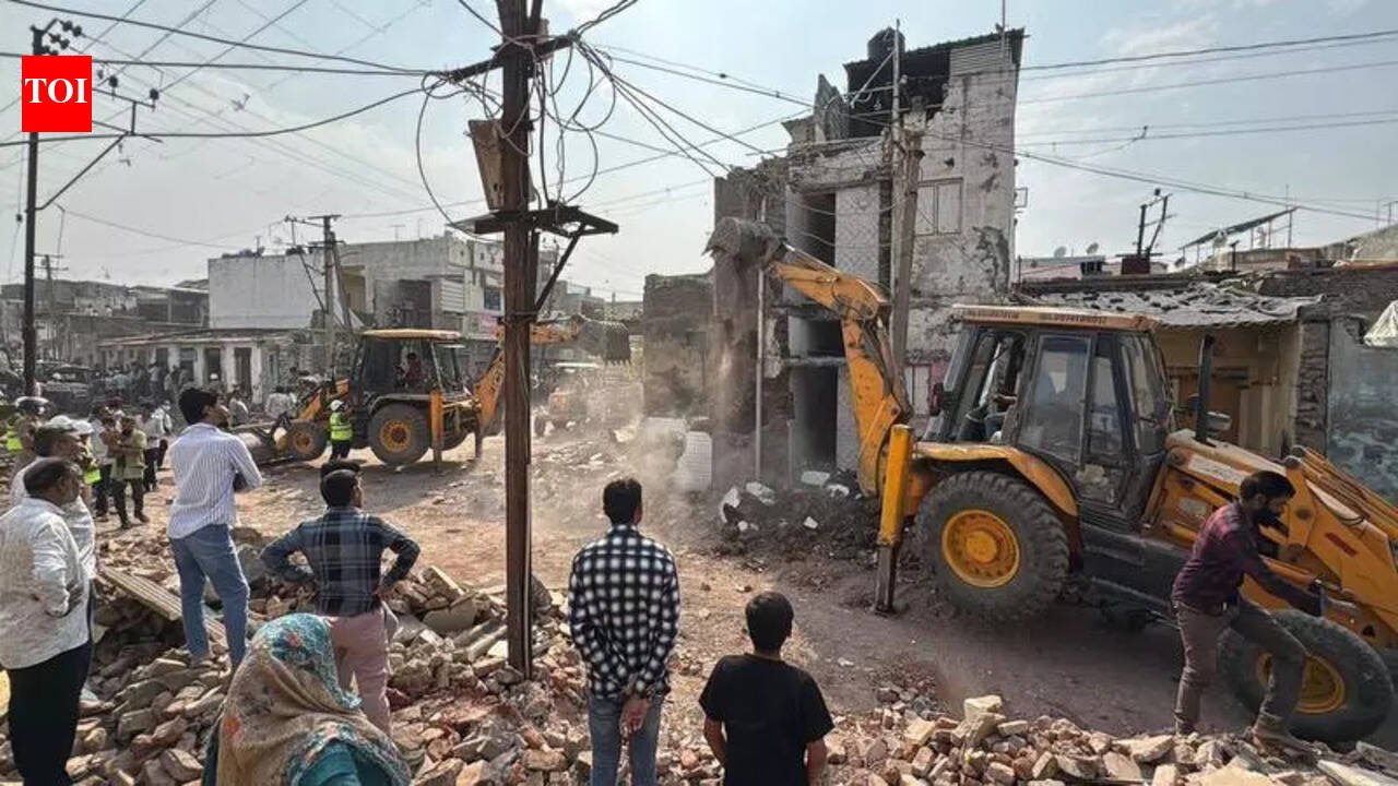 Rajkot: The Rajkot Municipal Corporation (RMC) launched a massive demolition drive on Monday, razing a majority of 1,400 illegal settlements spread across a 2.5km stretch in Jangleshwar and along the Aji River. The operation, carried out under tight security following orders from deputy chief minister Harsh Sanghavi, is expected to continue for three days due to the scale of the encroachments. By Monday evening, the RMC had removed over 1,000 structures.According to RMC officials, 65 excavation machines, along with tractors, dumpers and other heavy equipment, were deployed at the site early in the morning. Close to 1,000 RMC workers supervised the operation under police protection. The area was cordoned off and outsiders were not allowed entry to maintain law and order. Police and civic officials had been preparing for the operation for the past few days. Rajkot Zone 1 deputy commissioner of police (DCP) Hetal Patel said, “Around 2,500 police personnel, including local police, surveillance teams, drone surveillance units, special operations group personnel, quick response teams (QRT), and State Reserve Police Force, were deployed at the site during the demolition.”Authorities said they assisted residents who voluntarily vacated their homes over the past two days. Notices had been issued in advance, and water and electricity connections were disconnected before the operation began. The move riled many affected residents, several of whom said they had lived in the area for decades. Some expressed anguish, saying they were informed only three days before the demolition drive. They raised concerns about their future, fearing they might have to live on the streets. The RMC said some of the illegal structures had air conditioning and luxury furniture. According to an eyewitness, the entire cluster of settlements was reduced to rubble as the machinery moved in. Dust enveloped the area as the demolition progressed.