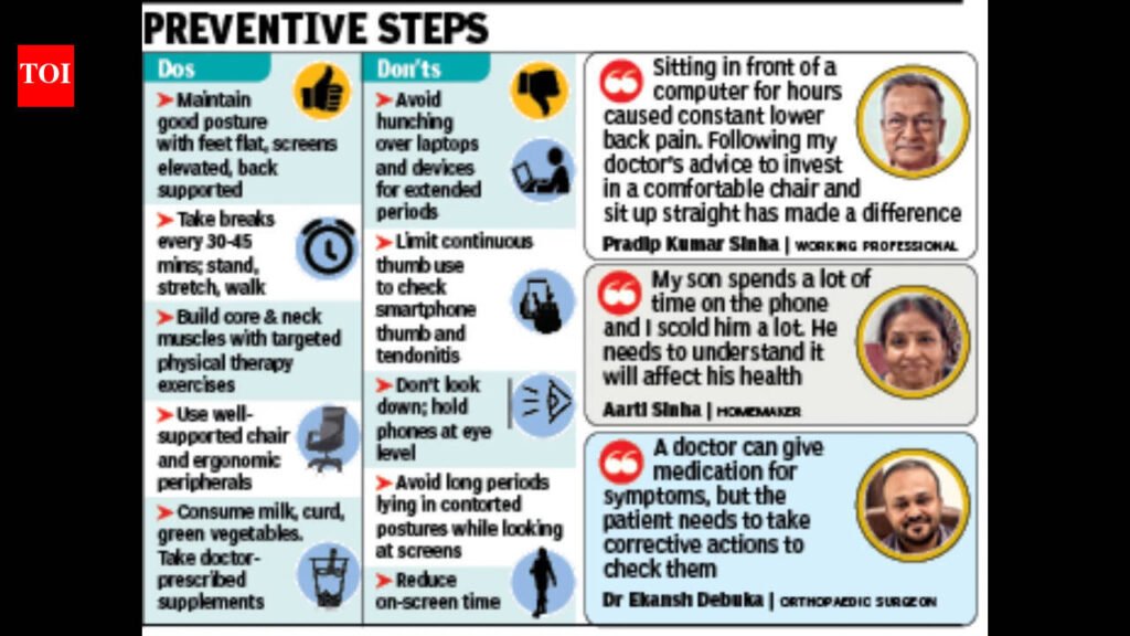 Ranchi: For 36-year-old Rachna Singh, a typical morning turned into a nightmare when she found herself pinned to her bed, unable to move due to excruciating neck pain. What she initially dismissed as bad sleeping posture turned out to be a severe case of cervical distress, triggered by relentless hours spent hunched over a laptop. Her story is not an outlier in the city, as doctors have reported a surge in cases where enhanced screen time affects leads to health issues in youngsters as well as working professionals.While Singh represents the workforce, 17-year-old Ansh recently found himself in an orthopaedic clinic after a sharp, stabbing pain in his right thumb. It was diagnosed as “texting/smartphone thumb” or tendonitis, a direct fallout of longer mobile usage. Orthopaedic surgeons said that their OPDs are flooded with patients as young as 13, all bearing issues related to more screen time.Dr Ekansh Debuka, an orthopaedic surgeon, said that he treats at least six to seven such cases daily. He said that among the younger generation, the most common complaints involve the thumbs and wrists. Continuous scrolling causes tendonitis and De Quervain’s tenosynovitis, a painful inflammation of tendons on the thumb side of the wrist, often coupled with cervical issues from lying in awkward positions while using mobile phone. For working professionals, slouching and poor ergonomics affect the neck and lower back.He said that these issues can be prevented with posture correction and simple ergonomic changes like using a good chair, a wireless keyboard and mouse and if necessary, setting the screen in the right position, among others.For children, it is important to have a screen-time lock. “Be mindful. As a doctor, I can give medications to suppress the symptoms, but it is up to the person to take corrective actions,” Debuka said.Dr Vinay Prabhat at the Rajendra Institute of Medical Sciences (RIMS) stated they get 10-12 patients every day whose problems in the cervical and lumbar regions are linked to longer screen time, often without patients realising the connection.Prabhat highlighted that a lack of outdoor activity, with children spending more time on smartphones, is leading to reduced bone mineral density, hampering their physical development.“Parents should be more watchful and instead of giving phones to their children to keep them busy, they should encourage outdoor sports as it is very important for a child’s physical development,” he said.He said that using a well-supported chair, sitting up straight, and taking breaks after half an hour or 45 minutes to get up and walk around can alleviate the health issues. He added, “Back extension exercises and isometric neck exercises help too. Taking calcium and vitamin supplements and consume milk, curd, cottage cheese, green leafy vegetables, among others, which help to strengthen the bones.”