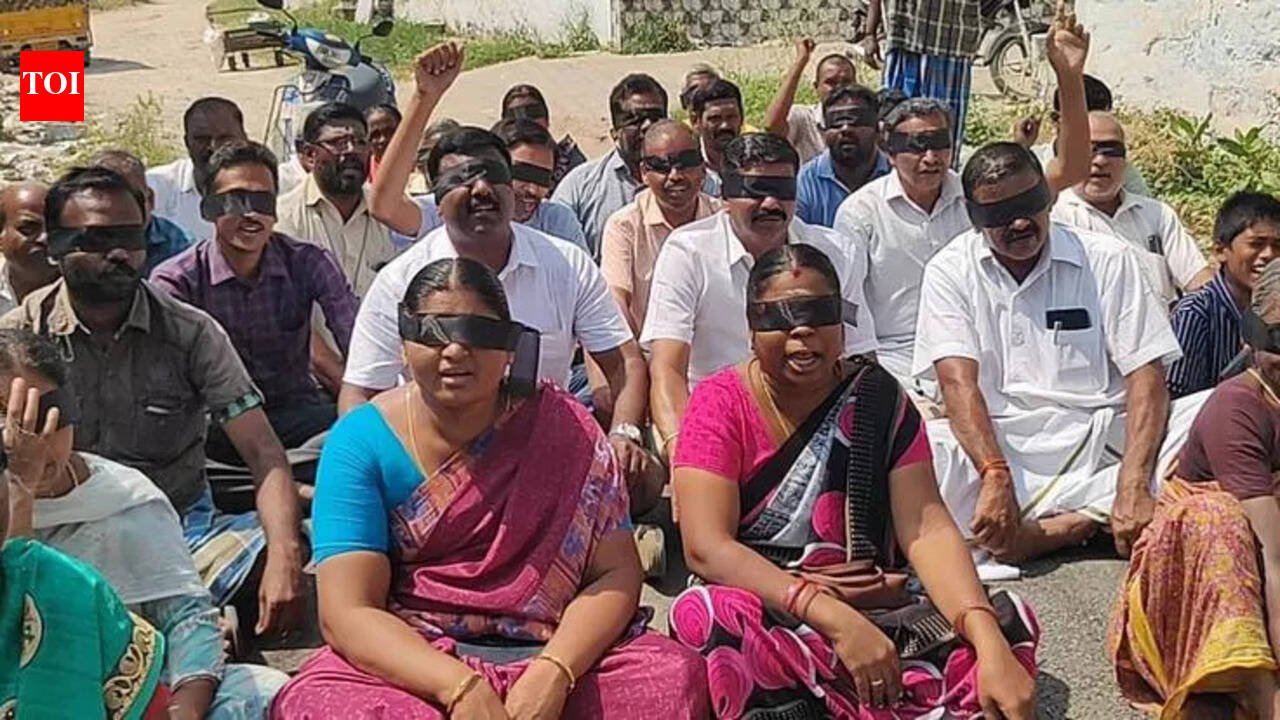 Namakkal: Residents of Kannimar Kadu and Malai Kadu near Pallipalayam in Namakkal district staged a blindfold protest on Thursday, accusing officials of failing to complete a long-pending tar road.More than 300 families which live under Agraharam Panchayat depend on the Kannimar Kadu route to reach the Sankari main road. A 500-foot stretch of the road is embroiled in a legal dispute, with one individual claiming ownership of the stretch. However, villagers insist it is a public pathway backed by documents and accused the individual of encroachment.“Although the panchayat recently laid a tar road after decades of demands, the disputed 500-foot portion remains unfinished. As a result, residents, motorists and college students continued to face hardship while using the route,” said M Madeswaran, a villager.Villagers added that they had already submitted petitions to the district collector Durga Murthy and concerned officials, despite which no action has been taken to complete the road. Condemning the delay, they covered their eyes with black cloth, crawled on the road and shouted slogans demanding that the stretch be tarred immediately.Locals also threatened to boycott the assembly election if their issue is not addressed.