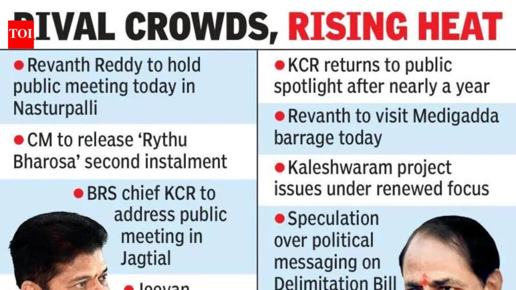 Hyderabad: Political heat in Telangana is set to escalate once again on Monday, as both chief minister Revanth Reddy and opposition leader K Chandrasekhar Rao, the former chief minister, are scheduled to attend separate public meetings on the same day, creating a buzz in the political arena.CM A Revanth Reddy will unveil the second instalment of financial assistance for farmers under the ‘Rythu Bharosa’ scheme at a public meeting in Nasturpalli, located in the Kataram mandal of Jayashankar Bhupalpally district. Accompanied by Agriculture minister Thummala Nageswara Rao and other officials, Revanth will remotely release the funds during the event.KCR rally in JagtialAt the same time, BRS chief KCR is gearing up for a public meeting in Jagtial, where former Congress leader Jeevan Reddy is expected to announce his joining the BRS. This marks KCR’s return to the public eye after nearly a year. Since the party’s defeat in the 2023 assembly elections, he has largely stayed out of the spotlight. His participation in the Jagtial meeting, following his appearance at the party’s silver jubilee event in Warangal on April 27 last year, is generating considerable interest in state politics.Adding to the intrigue, CM Revanth is also scheduled to visit the Medigadda barrage, part of the Kaleshwaram project, on the same day as KCR’s meeting. This has sparked speculation about whether he will target KCR or even Prime Minister Modi over the Delimitation Bill and the Women’s Reservation Bill.Furthermore, Revanth’s visit to Medigadda coinciding with KCR’s schedule has become a major talking point. It appears likely that the CM intends to highlight the issues at Medigadda and directly challenge the BRS and KCR. Recently, the govt decided to undertake repairs at Medigadda, Annaram and Sundilla as part of the Kaleshwaram project. As part of this initiative, the CM, along with minister Uttam Kumar Reddy, will inspect Medigadda on Monday. Observers are keen to see how Revanth addresses the challenges at Kaleshwaram this time.