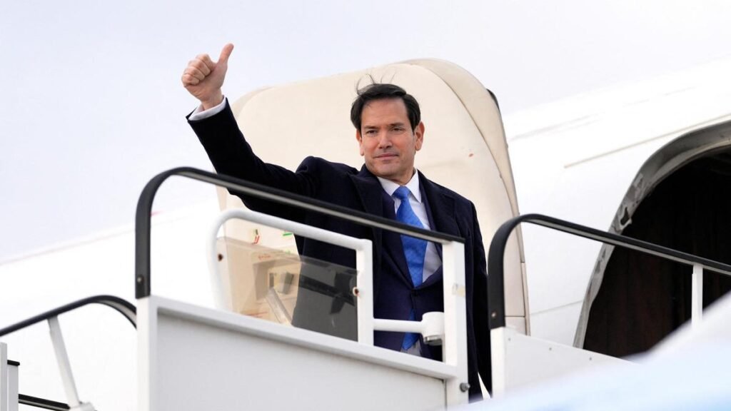 U.S. Secretary of State Marco Rubio gives a thumbs up as he boards a plane while departing Bratislava Airport in Bratislava on February 15, 2025.