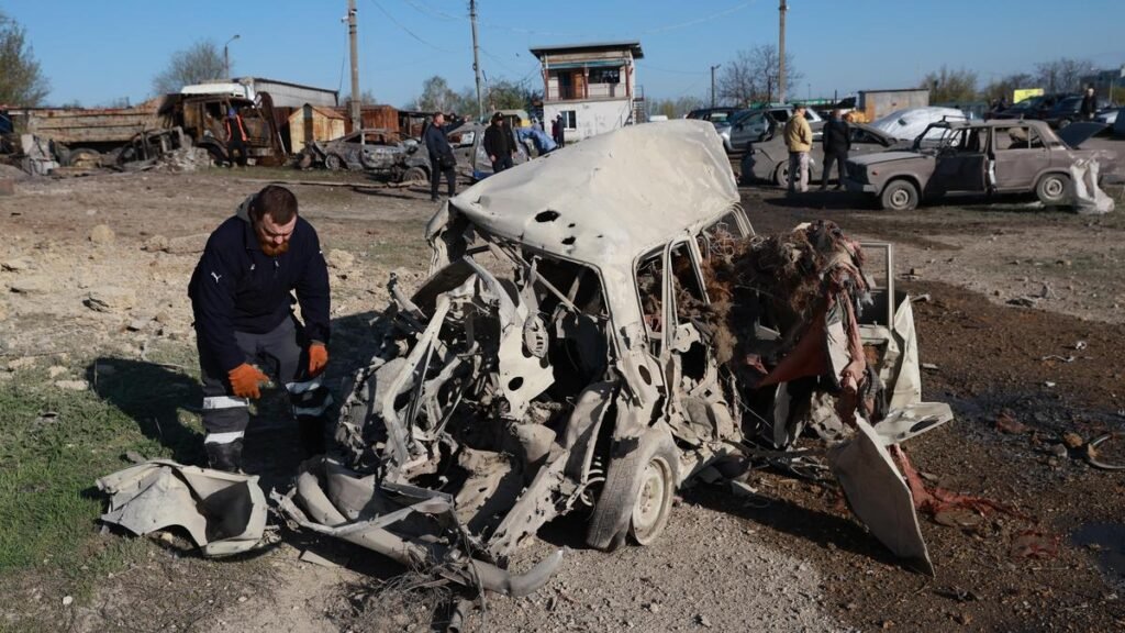 Cars damaged by Russia’s drone attack are seen in Zaporizhzhia, Ukraine, on April 15, 2026.