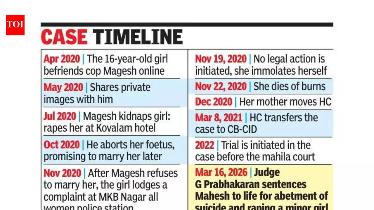 Chennai: More than six years after a 16-year-old girl died by suicide because police did not accept her complaint against a serving constable who had raped and impregnated her, a mahila court in the city found the cop guilty and sentenced him to life imprisonment.Judge G Prabakaran found the constable, Magesh, 27, who had since been dismissed from service, guilty of raping the minor, coercing her into abortion, refusing to marry her and abetting her suicide. He shall be in jail for the remainder of his natural life, ruled the judge on Monday.According to CB-CID, which took over the case following a Madras high court direction, Magesh befriended the victim in July 2020, at the height of Covid-19 lockdown. Magesh abducted her, confined her in a room at a guest house in Kovalam, and raped her. Later, on learning that she had become pregnant, he coerced her to undergo an abortion by falsely promising marriage.After realizing that she had been cheated, the girl lodged a complaint at MKB Nagar all women police station, but no action was taken. Dejected, the girl died by suicide at her house in Vyasarpadi on Nov 19, 2020. Three days later, MKB Nagar police registered a case on a complaint lodged by the victim’s mother. Following directions from Madras high court on Mar 8, 2021, the investigation was transferred to the CB-CID.The accused was charged with offences punishable under Sections 305 (abetment of suicide of a child) and 366 (kidnapping, abducting or inducing a woman to compel her into marriage or illicit intercourse) of the Indian Penal Code, along with relevant provisions of the Pocso (Protection of Children from Sexual Offences) Act.The trial was conducted before the mahila court in Allikulam court campus, with special public prosecutor A M Ravindranath Jeyapaul representing the CB-CID. On Monday, judge Prabakaran found Magesh guilty of the charges and sentenced him to rigorous life imprisonment. A fine of 50,000 was also imposed, and in case the fine is not paid, he shall undergo two years of simple imprisonment.Taking into consideration the mental trauma caused to the victim’s mother, the court awarded her 5 lakh as compensation. This amount is in addition to the compensation from the fine amount and includes any interim compensation already paid. The compensation must be paid by the Tamil Nadu govt within 30 days from the date of receipt of a copy of the judgment, the court said.