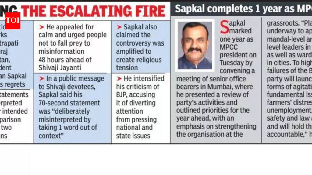 In a public message addressed to Shivaji devotees, Sapkal said his 70-second statement was “deliberately misinterpreted by taking 1 word out of context.” He claimed the controversy was amplified to create religious tension. “What happened in Pune shows how the issue was used,” he said, referring to protests that followed. “If any Shiv devotees’ sentiments were hurt because of misuse of my words, I sincerely express regret. It was never my intention to hurt anyone’s feelings. Let us put this matter to rest here.”He maintained that his original response was in the context of a question about displaying portraits of historical personalities in govt offices to promote unity. According to Sapkal, he said the 18th-century Mysore ruler drew inspiration from Chhatrapati Shivaji Maharaj in fighting the British, and the intent of displaying such images should be to convey harmony, not division.At the same time, Sapkal intensified his criticism of BJP, accusing it of diverting attention from pressing issues, including concerns over a proposed trade deal with US and farmers’ distress. “If BJP wants to cut my tongue because I expose them, then go ahead, but I will not stop,” he said, referring to statements by some BJP leaders who allegedly announced a reward for anyone who would “cut” his tongue. He added such threats would not deter him.