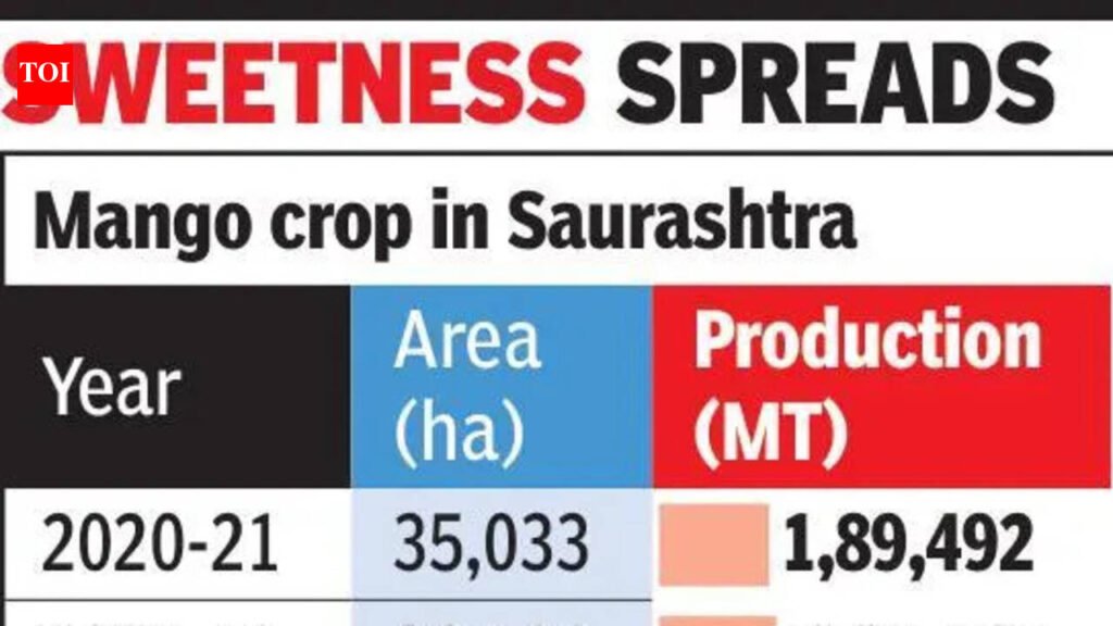 Rajkot: Despite climate challenges such as unseasonal rains, erratic weather and major cyclones like Tauktae, the king of fruits — mango — is not just surviving but thriving across Saurashtra. Data from the Gujarat horticulture department shows a steady rise in mango cultivation, with the area under the fruit expanding by nearly 10,000 hectares and production rising by over 1 lakh metric tonnes in the last five years.Once limited to traditional growing areas such as Junagadh and Gir Somnath, mango cultivation has now spread to nearly all talukas of Saurashtra. While farmers grow a few experimental hybrid varieties like sonpari and pusa arunima and heirloom varieties from the Nawab era such as dudh pendo and begam pasand, it is the kesar mango that dominates and drives this expansion.Official figures reflect this surge. In 2020-21, the area under kesar cultivation stood at about 35,000 hectares, with production of 1.89 lakh metric tonnes. By 2024-25, the cultivation area had increased to over 44,000 hectares, pushing production to 3.15 lakh metric tonnes. Data for 2025-26, including the last mango season, is yet to be released.Experts attribute the success of the kesar mango to its flavour, natural resistance to common diseases and strong export demand, particularly among the Gujarati diaspora in the US, Canada, Australia and Europe.Changing investment patterns have also played a role. Sources said several high-net-worth individuals are “parking” money in farmland, especially in the Gir region, and opting for mango cultivation. A farmer said, “These people don’t grow for profit but as a hobby. They want mango orchards where they can relax with family and friends and distribute the fruit in their groups.”The cultivation map is also undergoing a visible shift. D K Varu, principal and dean of the College of Horticulture at Junagadh Agricultural University, said new pockets of growth are emerging. “Young farmers are experimenting and expanding. New kesar-growing areas have developed, including the hilly terrain between Ranavav (Porbandar), Bhanvad and Kalyanpur (Devbhumi Dwarka), Upleta (Rajkot) and Jesar in Amreli district,” he said. He added that districts such as Bhavnagar, Rajkot, Morbi and Jamnagar are also adopting kesar cultivation.Tushar Dhameliya, director of a local Farmer Producer Organization in the Gir area, said young farmers are shifting from traditional crops to horticulture. “Young farmers are moving towards horticulture from traditional crops and kesar mango is their first choice because it is a cash crop and requires minimal extra care after the initial two to three years,” he said. Dhameliya noted that while many farm commodities struggle to fetch good prices, “Mangoes guarantee a good price in the urban market and offer huge potential for exports, giving farmers a chance to earn in dollars.“