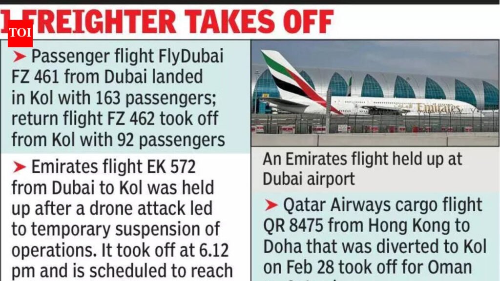 Kolkata: For the first time since the outbreak of war in West Asia, two aircraft took off from Kolkata for the region on Saturday. While one was a passenger flight, the other was a freighter. The count would have been three had a drone attack near Dubai airport not forced suspension of operations that held up an Emirates Airlines flight that was scheduled to reach Kolkata on Saturday evening. It finally took off on Saturday evening with over 200 passengers and is expected to reach Kolkata around midnight.FlyDubai flight FZ 461 touched down in Kolkata at 12.53am on Saturday and brought back 163 passengers. This was only the second flight to reach the city from the war zone. On Thursday, another FlyDubai flight flew back 130 passengers. Return flight FZ 462 took off with 92 passengers at 1.59am. On Thursday, there were only 55 passengers on the departing flight.A Qatar Airways Boeing B 777-200 cargo aircraft, which was diverted to Kolkata on Feb 28 after the airspace in Qatar was shut down following counter-strikes by Iran, also took off for Jeddah at 3.58 am on Saturday after the situation appeared to improve following an announcement by Iran that it would not target neighbouring countries and apologised for the recent attacks.However, hours later on Saturday morning, an Iranian drone attack near the main terminals of Dubai International Airport forced a temporary suspension of operations. Emirates flight EK 572, which was scheduled to fly to Kolkata on Saturday evening, was among scores of flights that were held up. Booked on the flight were at least 12 holidayers who were part of a 30-member group from Kolkata. Bangur Avenue resident and businessman Govind Nag, who, along with his wife Sutapa and son Shagnik, managed to return to the city on Saturday via Hyderabad, expressed concern over the uncertainty his fellow holidayers were facing. “We were part of a 30-member group that reached Dubai on Feb 27 to tour the UAE until March 5. We just saw Burj Khalifa when the war broke out. Though Dubai functions normally during the day, it is tense thereafter, with sirens going off, warning of drone or missile attacks. The streets would be deserted. I managed to book tickets on an Etihad flight from Abu Dhabi to Hyderabad on Friday,” Nag recounted. Early on Saturday, flight movements from Abu Dhabi and Dubai raised hopes of gradual normalisation of services between Kolkata and West Asian hubs Dubai, Abu Dhabi and Doha. With five airlines — Emirates, Etihad, Qatar, FlyDubai and Air Arabia —operating 34 flights a week between Kolkata and hubs in the Gulf, most flyers to the region and beyond to Europe and the US travelled on these airlines.“The war disrupted travel everywhere, but it hit Kolkata more than other major cities as there are no direct flights to Europe and the US from here,” explained Travel Agents Association of India chairman (East) Anjani Dhanuka.An official of a Gulf carrier said that while the airline is keen to resume flights, airspace safety will determine whether flights will operate or continue to be cancelled.