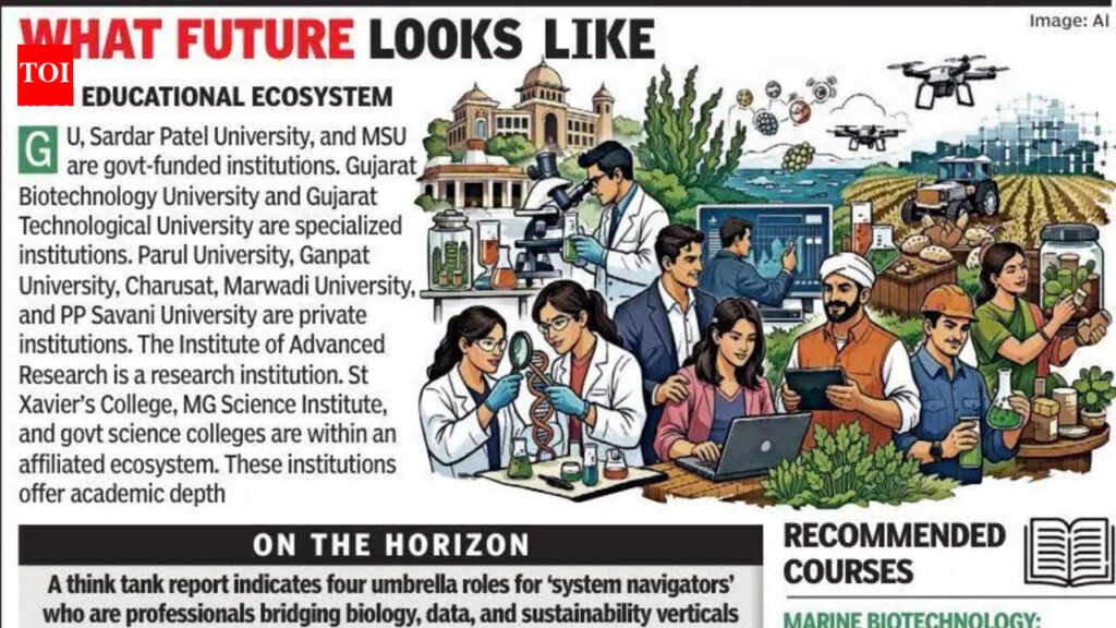 Ahmedabad: While the state is often termed the ‘pharmacy of India’ due to a mature ecosystem of pharmaceuticals in terms of both education and industry, Gujarat has the potential to become a biotechnology powerhouse, indicates a report by the Gujarat Rajya Institution for Transformation (GRIT), a think tank of Govt of Gujarat. The recently released report ‘Gujarat Bioeconomy 2030: Strategic Skill Architecture and Workforce Development’ charts a course for the future of bioeconomy and how education needs an overhaul to achieve that goal.Experts called for a department of biotechnology (DBT) institution in the state and also advocated for making the Gujarat Biotechnology University (GBU) or Gujarat Biotechnology Research Centre (GBRC) an institution of national importance to give impetus to the sector. “Based on an exhaustive analysis of 23 relatable biotechnology institutes within the state, comparative benchmarking with states, and an assessment of global industry trends, this document identifies a possible synergy between academic output and industrial requirement,” reads the report. It adds, “Unlike Hyderabad or Bangalore, which are anchored by DBT-funded autonomous institutes that drive innovation and high-level skilling, Gujarat doesn’t have a central, federally funded node for biotechnology research excellence.” The report goes on to say, “This want cascades down to the curriculum level where syllabi remain theoretical, slanted towards classical microbiology and biochemistry, while the industry pivots towards synthetic biology, metabolic engineering and AI-driven drug discovery.” The primary focus of the report is on strategies for overhauling. Firstly, curriculum modernization is proposed with the introduction of specialized BTech and MTech modules in synthetic biology, bioprocess engineering, and computational biology. The report calls for institutional alignment with a state-backed centre of excellence (COE) to bridge the research-training gap. It calls for vocational momentum by leveraging Life Sciences Sector Skill Development Council (LSSSDC) frameworks to launch industrial ‘finishing schools’ that function as bridges between the classroom and the factory floor.