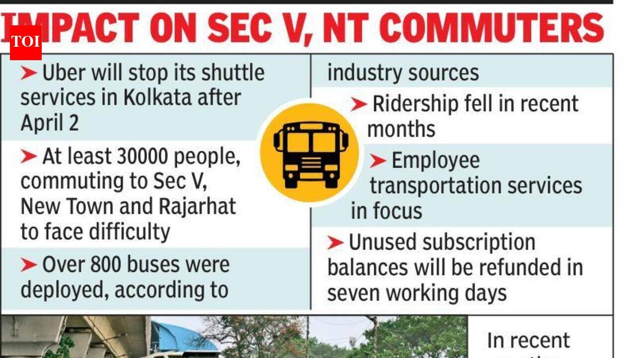 Kolkata: Uber will discontinue its Shuttle services in Kolkata after April 2. The company mentioned this to its users in a notification. This could impact around 30,000 commuters travelling to Sector V, New Town and Rajarhat.Often people travel to these locations from Joka, Maheshtala, Kamalgazi, Howrah and Dunlop. Sources within the industry claimed that over 800 buses were being used for this service. For a trip, bus owner would be paid Rs 2500, claimed a sources. The amount would be less for mini-buses. In the last few months, the ridership had fallen. The rate of seat occupancy would be around 40% to 50%.The exit cause was not revealed by Uber. The company had stated it was strategically shifting focus towards Employee Transportation Services. They felt that the demand in that segment was more.“While Uber Shuttle will no longer be available, you can continue to rely on other Uber products for your transportation needs,” Uber wrote back to TOI on the X platform. Any unused subscription of the user will be refunded to Uber credits. This credit reversal would be done within seven working days. Support services will continue for pending payments and queries, the officers from the company said. Daily commuters are worried. “This will increase both cost and time,” claimed Aniruddha Dasgupta, a resident of Greenfield City.The decision comes at a time when both private and govt buses are going off the road due to the upcoming state elections. Other technical issues and fuel crisis are also contributing factors for the poor state of transport.Uber Shuttle services had gained traction among workers going to offices. Commuters also hoped that they would have some alternative travel options. They are rethinking about their commute.A transport department official said more buses would be added, if needed.