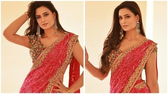 The 45-year-old actor opted for a lehenga-saree in a rich, deep pink shade that perfectly complemented her skin tone. The lower half featured a heavily pleated, flowing skirt that mimicked the drape of a lehenga. In contrast, the dupatta was draped elegantly across her shoulder like pallu, adorned with intricate floral embroidery and a thick, gold-sequined border.