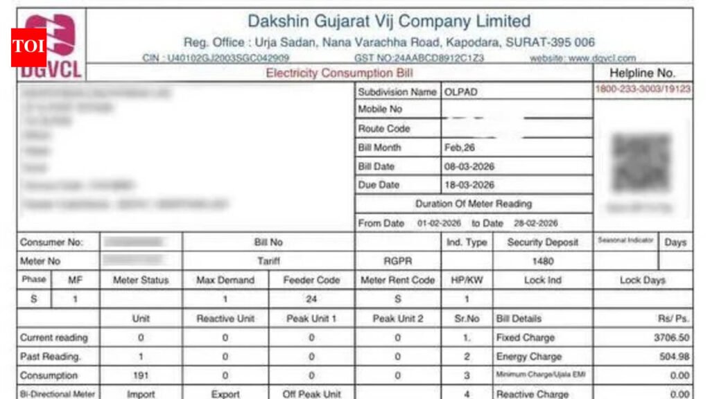 Surat: Poor network connectivity persists in remote parts of Gujarat, but even areas around the Diamond City are facing the challenge, hitting those who have adopted modern infrastructure.In Nov when Hardik Lad got a solar plant installed at his home in Sithan village, around 10km from the city, he expected his power bill to fall. Encouraged by the benefits, he also opted for a smart meter. During the solar installation, Dakshin Gujarat Vij Company Ltd replaced a working digital meter with a smart meter as part of a billing upgrade. He now faces a problem. After the installation of smart meters, users are not getting clear details of actual use and charges. Bills show adjustment amounts, but without any explanation. In his March bill, the total of fixed charge, energy charge, fuel charge and electricity duty is Rs 4,997. The payable amount was Rs 22 due to an adjustment of Rs -3,887. “I could not understand initially how much electricity the solar plant is producing and how much we are using. We were told that it would regularize after some time. But despite changing two mobile sim cards in the meter by the service provider, the meters are unable to transmit data,” Lad, a mechanical engineer, told TOI. He also raised concerns about whether meters are recording data correctly. Despite multiple complaints, Lad has not received a solution. Before the solar plant was installed, his electricity bill used to range between Rs 1,200 and Rs 3,000 for two months. “There are issues related to network connectivity and in some cases, we have to carry out manual reading. We are not charging any additional amount in such cases and attempts are on to resolve the problem,” said a DGVCL official. Another resident of Sithan, Atul Lad, a manager in a factory, is facing a similar issue. “After the installation of the solar power plant and smart meters, I was hoping that I would be able to save well on electricity. Savings are there, but with uncertainty as I do not know how much electricity I produce and how much is used,” said Atul. After a solar power plant is installed, DGVCL installs two smart meters — one for electricity production and another for consumption. These meters transmit data to a server, which reflects in the mobile app, allowing users to check daily production and consumption. DGVCL officials said staff visit such locations and collect data manually. The data is then fed into the system and the bill is generated. “If there are similar issues, we will investigate them and resolve them. It is important to find out why there is an issue,” said a senior DGVCL official. In an industrial area, Vimal Anghan, the owner of a textile weaving unit at Anjani Industrial on the city outskirts, said that despite installing a solar power plant in Aug, his bills have not fallen. “I have a 65 kV solar power plant installed at my unit and even now average power bills are being issued. I believe I am not getting the full deduction for power generated,” said Anghan.