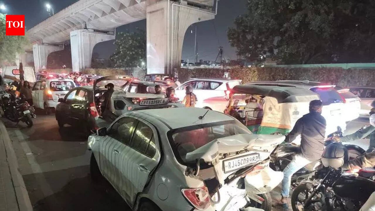 Jaipur: Chaos erupted near Udyog Bhawan Cut Monday after a speeding pickup truck lost control while descending from the elevated road and crashed into nearly eight vehicles waiting at a red light and injuring one person.According to accident (south) police, the pickup truck was coming from the Sodala side and was loaded with grey granite stones. “As it came down from the elevated stretch, the vehicle suddenly accelerated and the driver appeared to lose control. The pickup then rammed into cars standing across two lanes and also struck an autorickshaw with considerable force,” said a police officer. The accident took place around 6.15 pm, causing panic among commuters at the busy intersection, and it also caused a traffic jam for around two hours. Despite the intensity of the collision, no serious injuries were reported among drivers or pedestrians. However, multiple vehicles suffered damage to their front and rear portions. An auto rickshaw driver sustained a minor injury and was discharged from SMS Hospital after first aid.The impact led to heavy congestion in the area for some time, with traffic coming to a standstill. Traffic police and accident (south) police officials reached the spot and worked to clear the damaged vehicles, restoring normal movement after the disruption. “The traffic was cleared around 8 pm,” said an officer.Preliminary investigations indicate that over-speeding, possible over-loading, or brake failure may have been key factors behind the incident.Police have detained the driver for questioning and initiated a technical inspection of the vehicle, including an examination of its braking system, to determine whether brake failure or mechanical defects contributed to the crash.