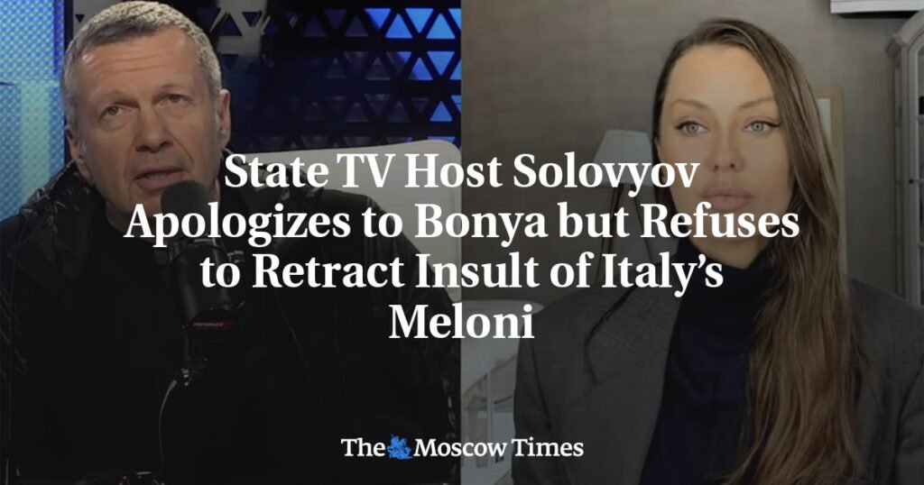 State television host Vladimir Solovyov apologized on-air to influencer Viktoria Bonya after previously insulting her, but refused her call to apologize to Italian Prime Minister Giorgia Meloni, as the two sparred over criticism of President Vladimir Putin and problems inside Russia.