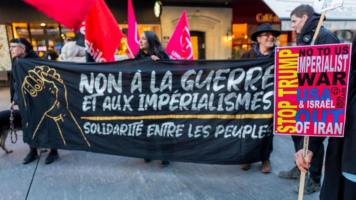 People hold a banner with writing reading in French “No to war and imperialists, solidarity amongst peoples” during a demonstration against the U.S. and Israeli strikes on Iran, in Geneva, Switzerland.