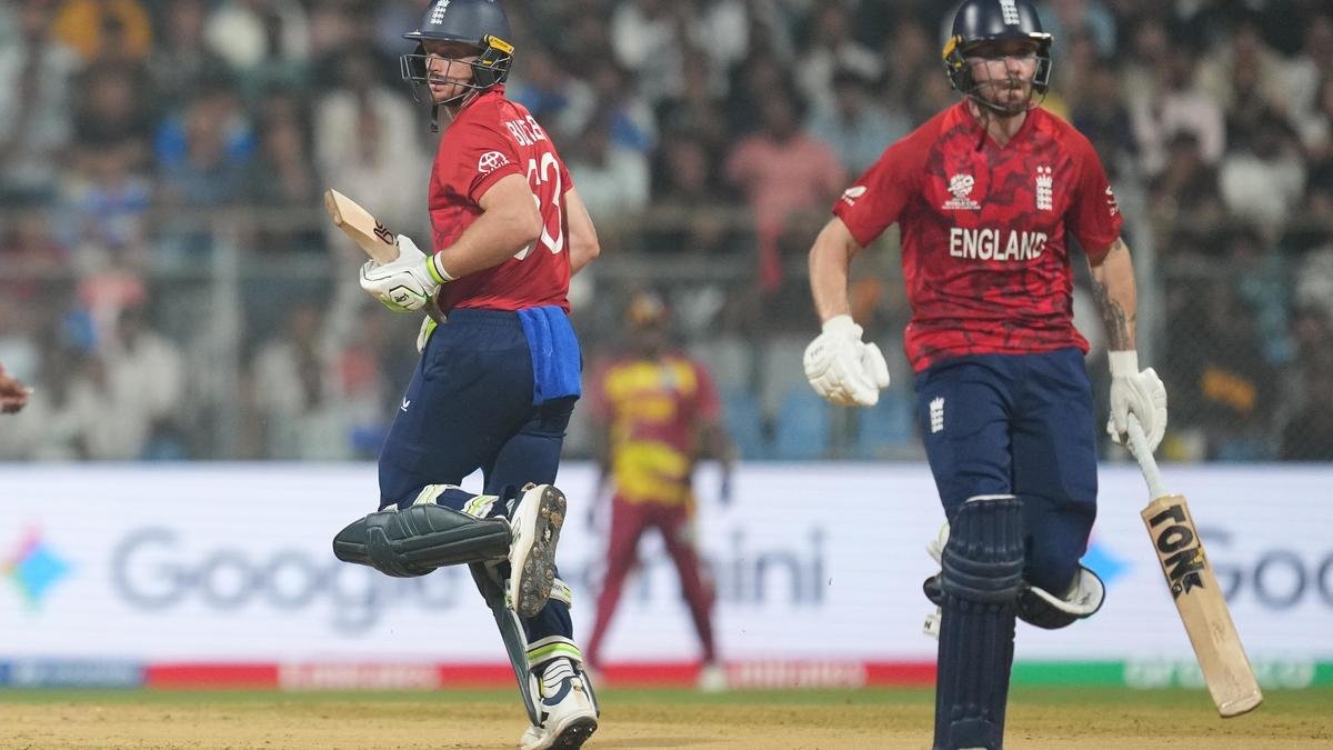 England’s Jos Buttler, left, and Phil Salt run between the wickets during the T20 World Cup cricket match between England and West Indies in Mumbai, India, Wednesday, Feb. 11, 2026.