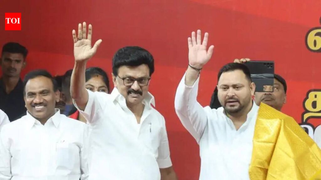 Coimbatore: Rashtriya Janata Dal (RJD) leader Tejashwi Yadav, who is the opposition leader in Bihar assembly, on Saturday lauded Tamil Nadu’s governance model at a public meeting in Mettupalayam.He presented a statue of Buddha to chief minister M K Stalin and said leaders like C N Annadurai and M Karunanidhi had set benchmarks in politics. Praising Stalin, he said Tamil Nadu was being successfully governed on the principles of social justice. He described the state as a model for “unity in diversity” and added that Tamil Nadu ranked second in overall national growth. Pointing out that the BJP-led govt was seeking to reshape the constitutional and federal structure, the RJD leader said the bill would be defeated with the support of Stalin and other opposition parties. “Stalin played a key role by ensuring the presence of all his MPs in parliament even during the election period, sending a strong message to Narendra Modi and AIADMK. This reflects true conviction – when Tamil Nadu rises, India rises; when Tamil Nadu chooses justice, India moves closer to its core values,” he said. Earlier, Tejashwi Yadav addressed the media at Coimbatore airport and stated the women’s reservation law was already passed and delimitation was a separate issue planned for 2029. He stressed that a caste census and updated population data were essential, and that reservations should be based on 2025 figures and not that of 2011. He accused the Centre of pushing an RSS agenda and said the opposition would resist the same.